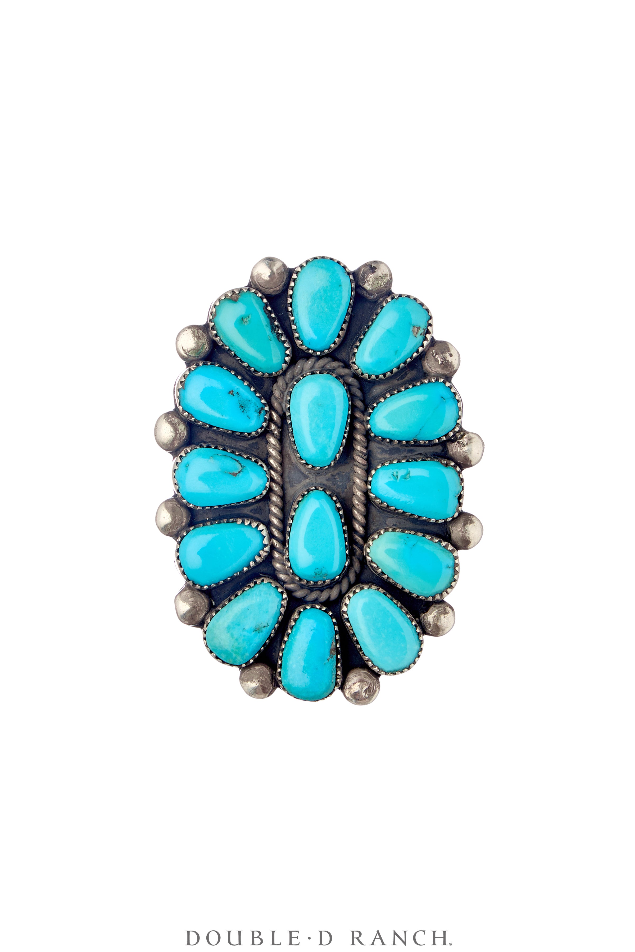 Turquoise truly will never go out of style, and this vintage ring is no exception. Each bold and beautiful Sleeping Beauty turquoise stone is set in a serrated bezel and accented with sterling silver drops and twist wire for a classic cluster creation. Traditionally inspired and full of beauty, it is a piece that will last a lifetime.