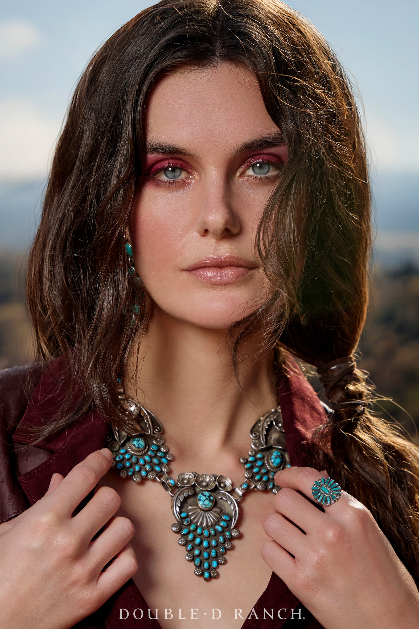 We are a sucker for a classic cluster ring and this piece by Evans Waatsa, sucked us right in. Each of the bright and bold turquoise stones is set in a serrated bezel and accented with sterling silver drops and twist wire. Traditionally inspired and full of beauty, a piece that will last a lifetime.
