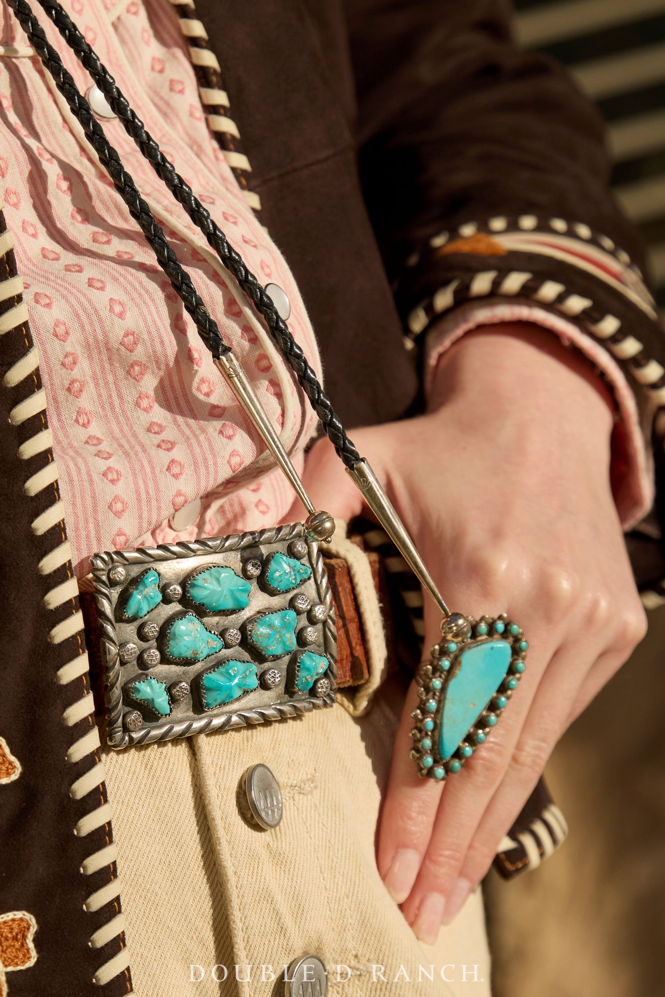 A signature statement ring can say a lot, and this timeless 1970s-era vintage piece by Navajo artisan Dick Leekity fits the bill. The central stone of freeform turquoise is framed with tiny snake eye turquoise stones, all set in simple silver bezels and accented with sterling silver rope and silver drop details. At 50 years old, it’s already proved it will stand the test of time!