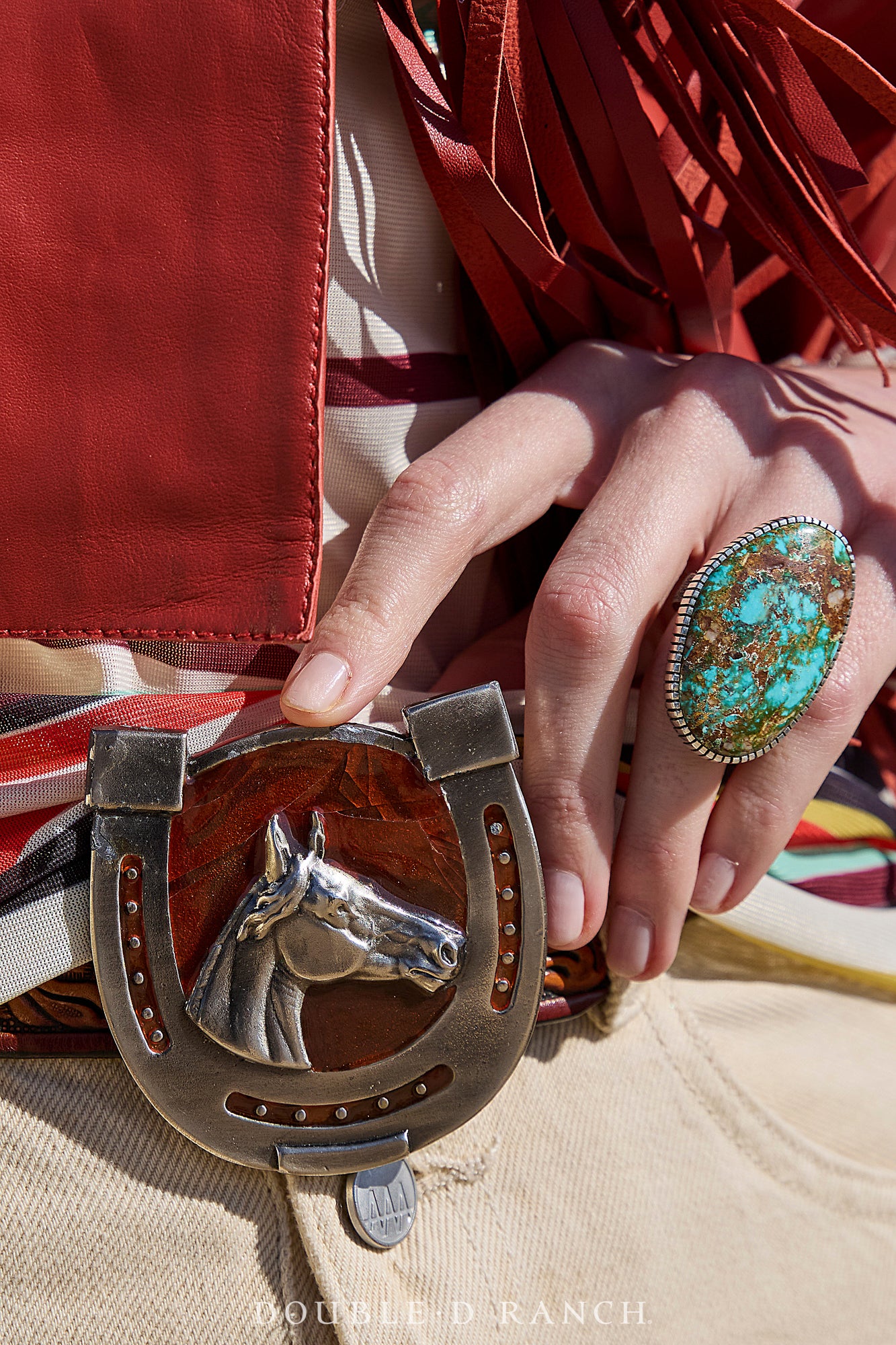 A big and bold turquoise statement is never a bad idea. This contemporary ring is crafted from Royston Mine turquoise and set in a sterling silver serrated bezel. The stone has vibrant color with strong caramel matrix and is set on a classic sterling silver band. An eye-catching forever favorite.