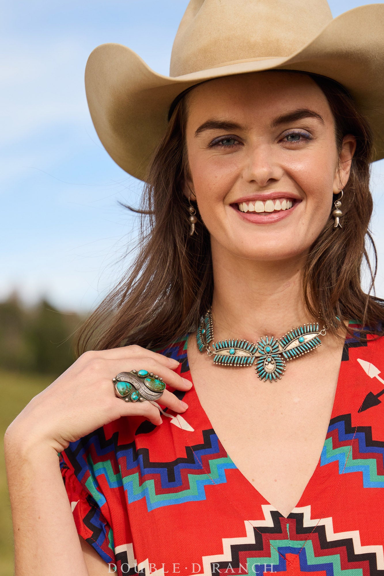 Standout statement rings are guaranteed conversation starters and this bold beauty features four stones of beautifully matrixed turquoise accented by applique and substantial sterling silver drops. Timeless classic.