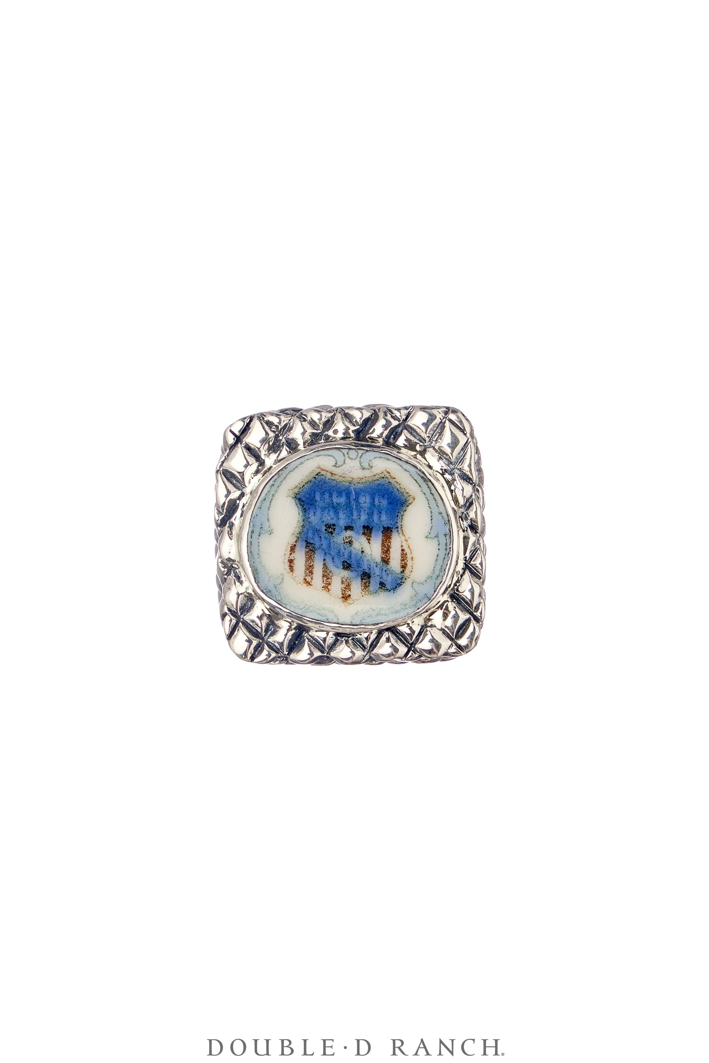 A master of southwestern style, the renowned artisan wows with this contemporary creation, boasting a single inlaid shard of discarded authentic railroad china emblazoned with the emblem of the Union Pacific Railroad Overland. The piece is set in a bold, polished sterling silver setting for an enormous statement ring that is a one-of-a-kind conversation piece – and instant collector’s item.
