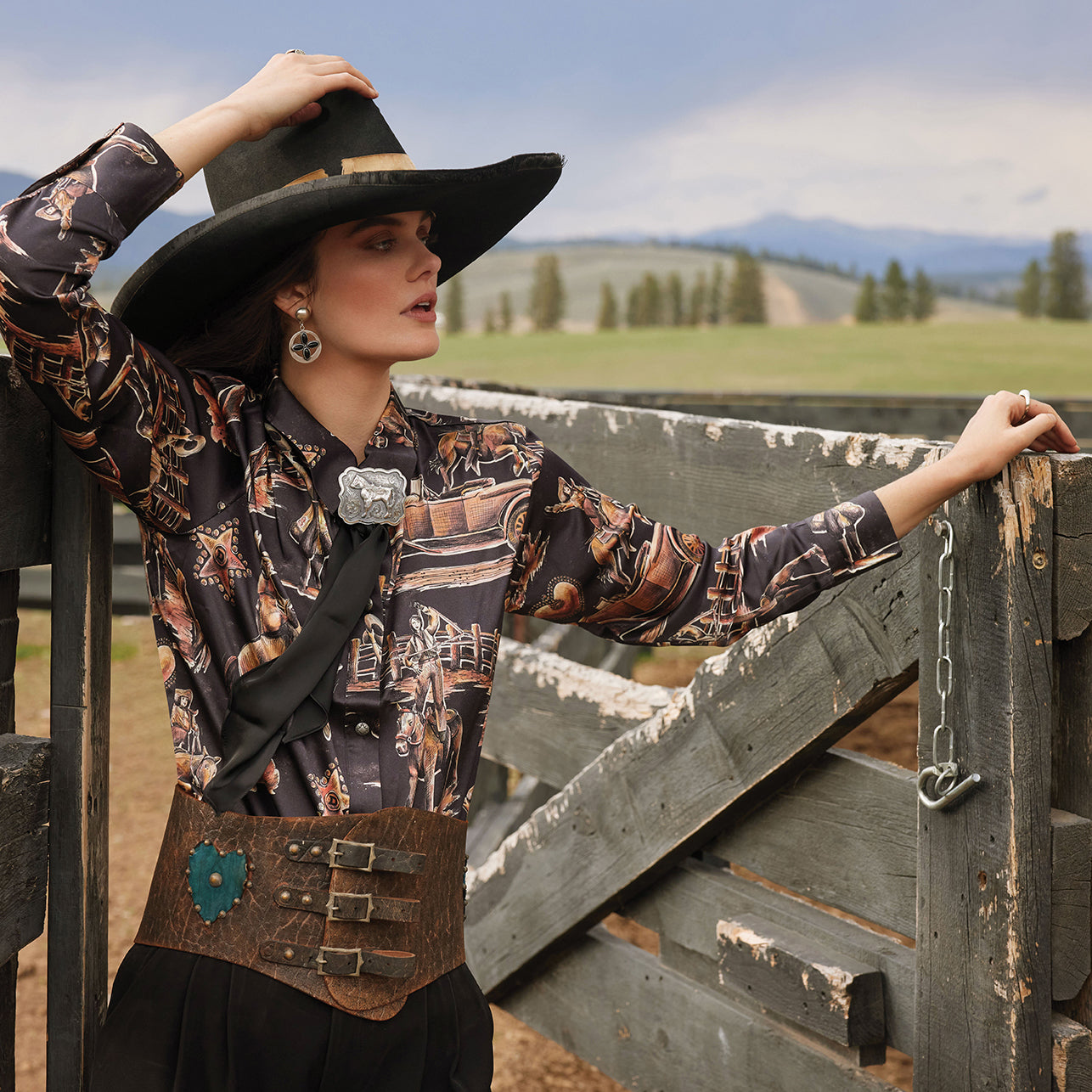 We’ve said it a jillion times, but we’re a sucker for a scarf slide. It takes all the guess work out of tying your scarf or bandana, plus it adds a little pop of personality. This little beauty by Shawna Erickson is a sterling silver slide crafted in the style of a trophy belt buckle, boasting “Best Dressed Cowgirl Champion” accented by intricate scrollwork and brass hearts in each corner. Detailed and dimensional, it’s a gorgeous hand-crafted contemporary creation crafted exclusively for Double D Ranch.
