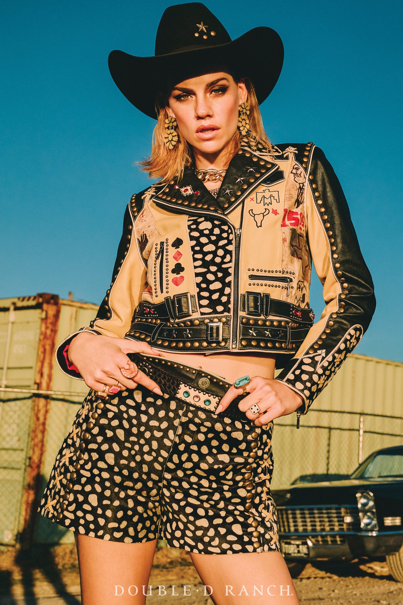 These statement shorts walk the line between unforgettable and incredibly versatile. The spotted print takes on a new level of eye-catching in the hair-on hide, but the black-and-cream colorway makes it easy to pair with anything from a black tank to a chambray button-down. They’re finished with a leather waistband, studded details, and leather lacing that lends a Western lean and a decidedly DDR feel.