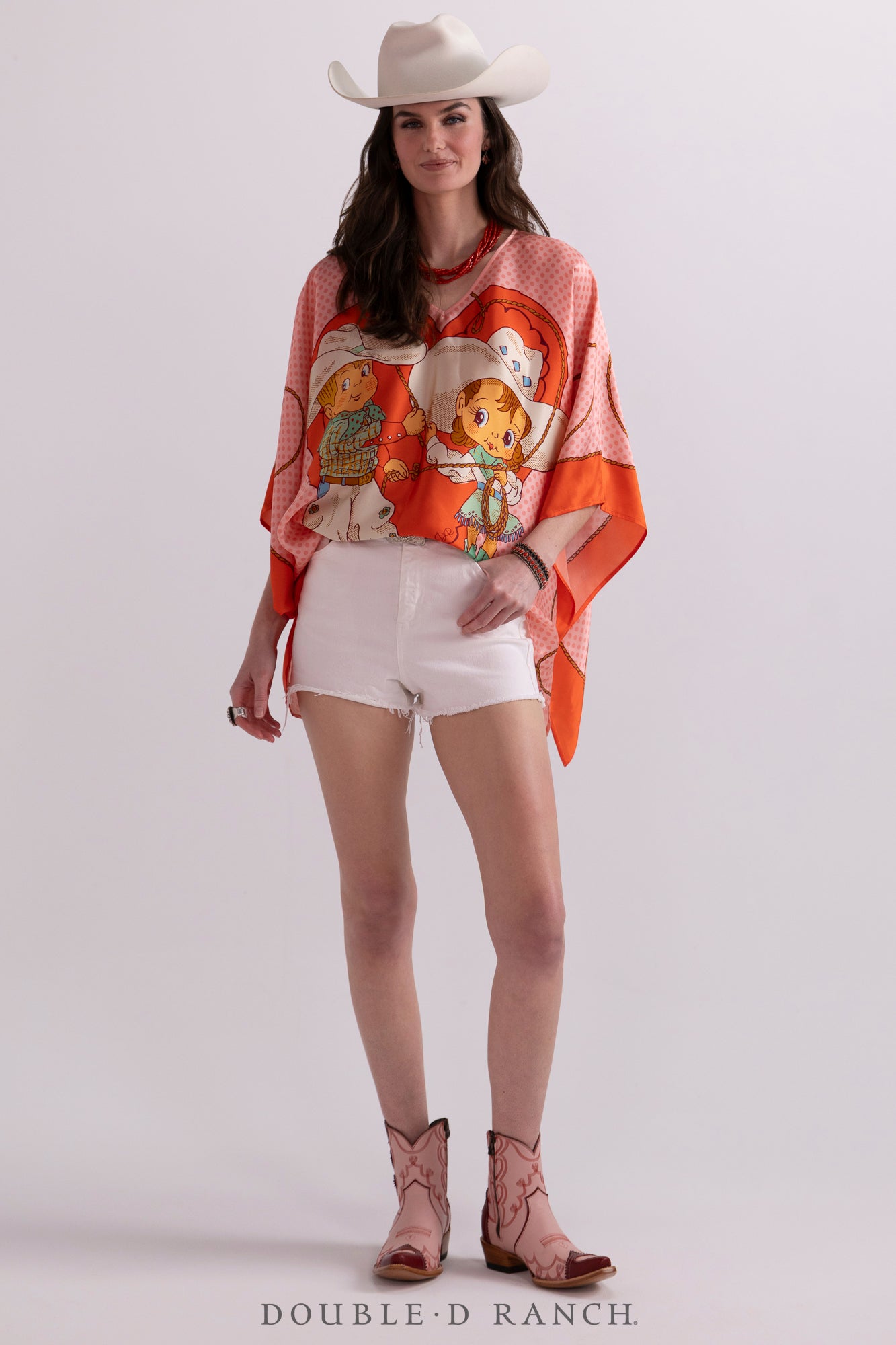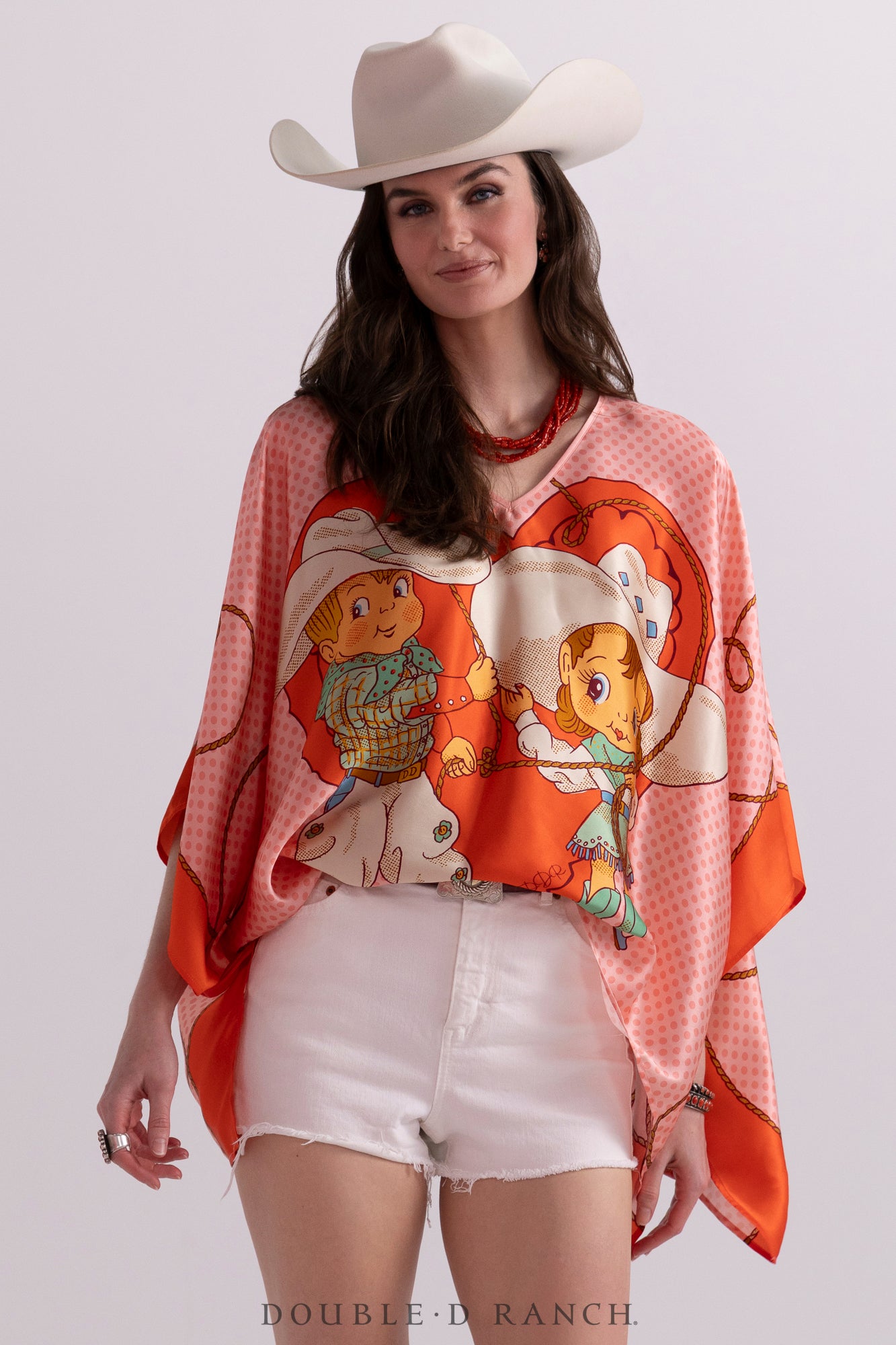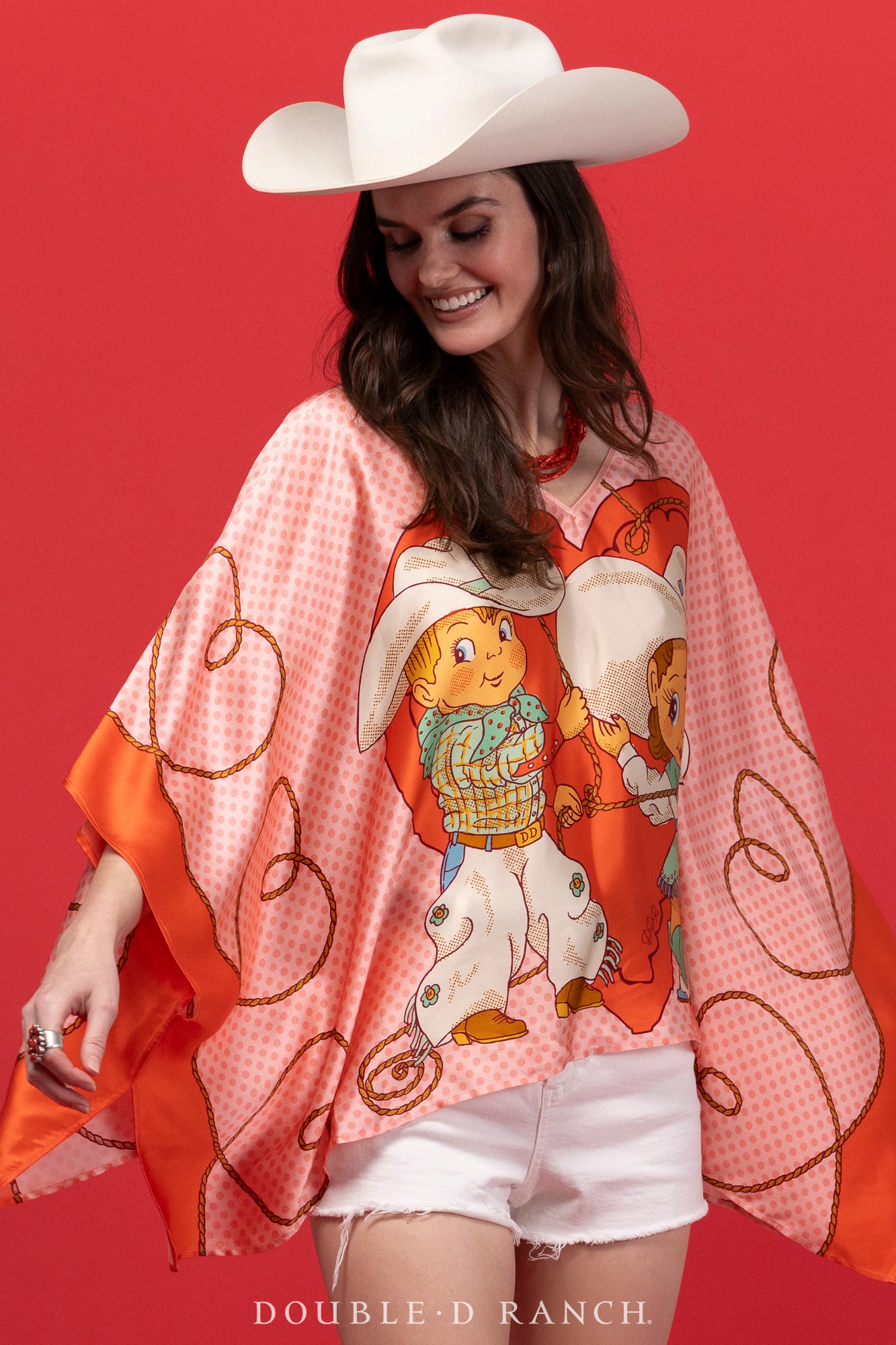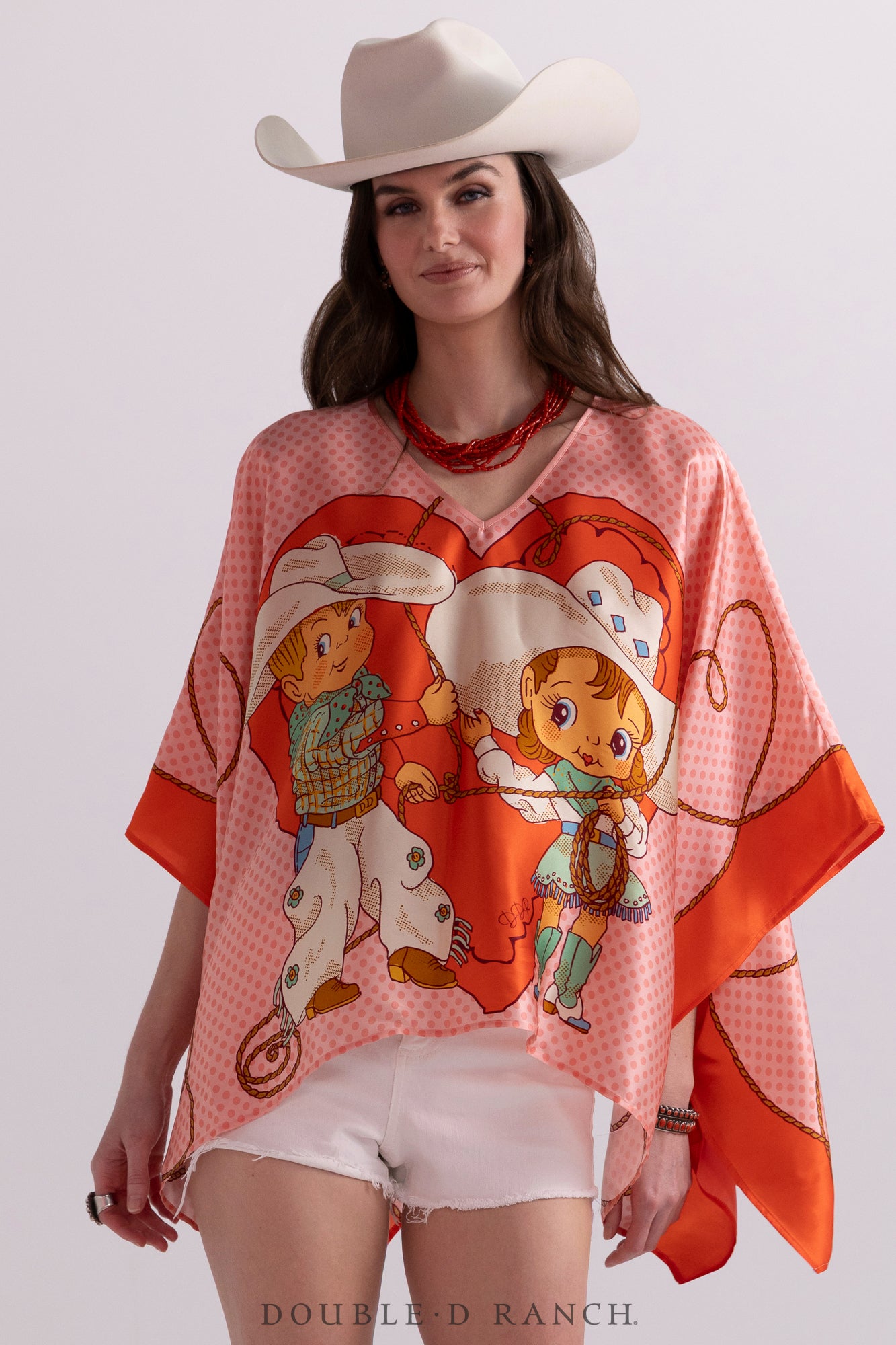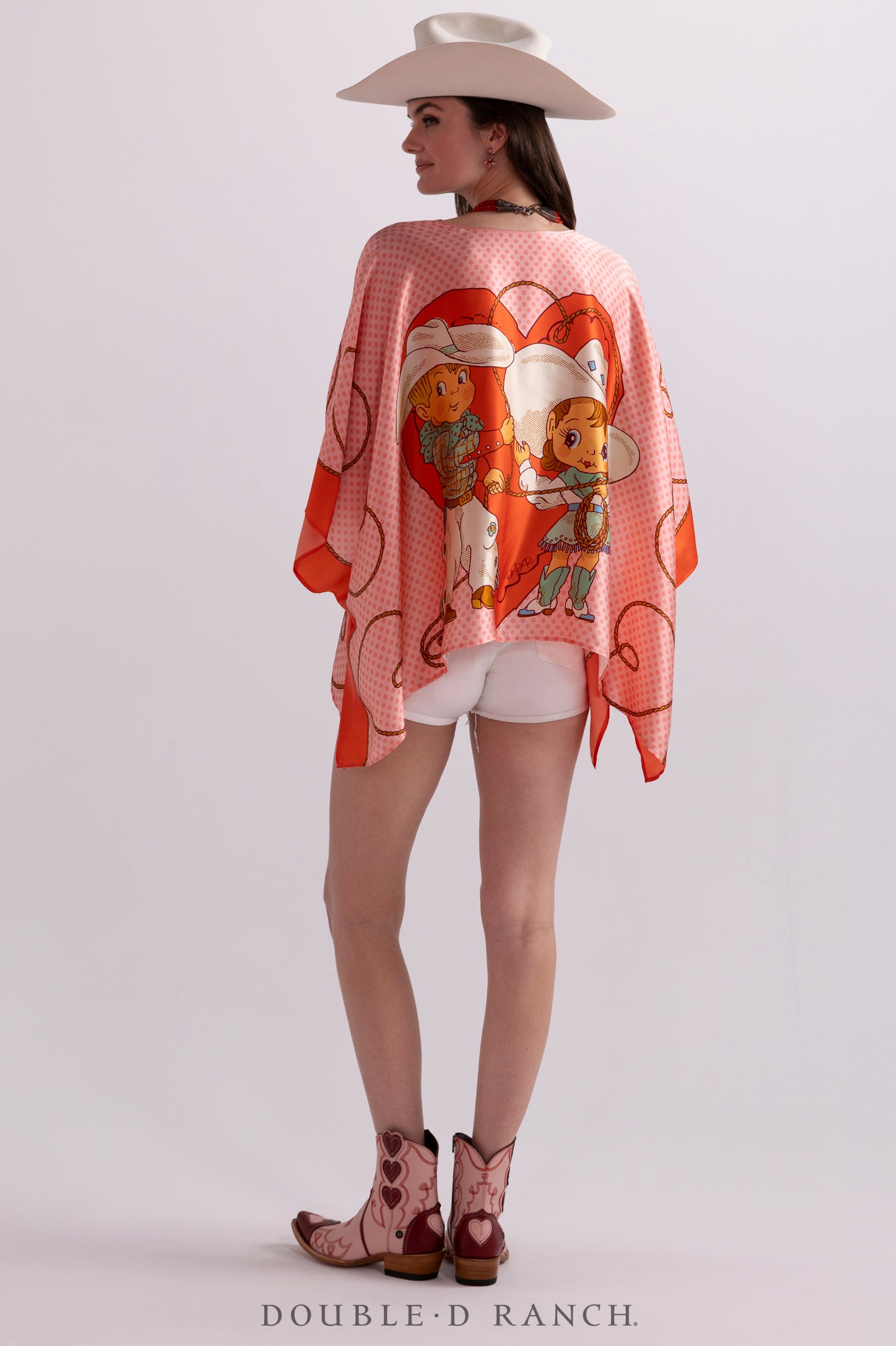 As part of our first-ever Valentine’s Day capsule collection, we created this precious poncho with our custom-designed cherubic cowboy/cowgirl couple big and bold, front and center, on a luxurious silk in a classic silhouette. It’s sleek and chic in the perfect pink-and-red palette to style your V-Day look!