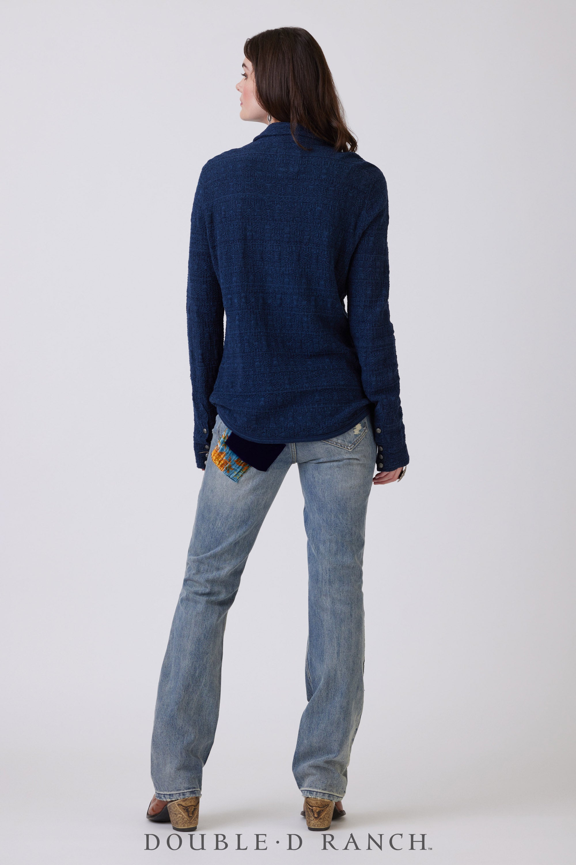 You’ll be surprised at all the ways this blue beauty works in your wardrobe. It’s a slightly textured beautiful midnight blue complemented with custom concho buttons. It can be a shirt or a jacket and works with everything from denim to dressy pants. Trust us, you’ll reach for it more than you realize.