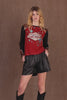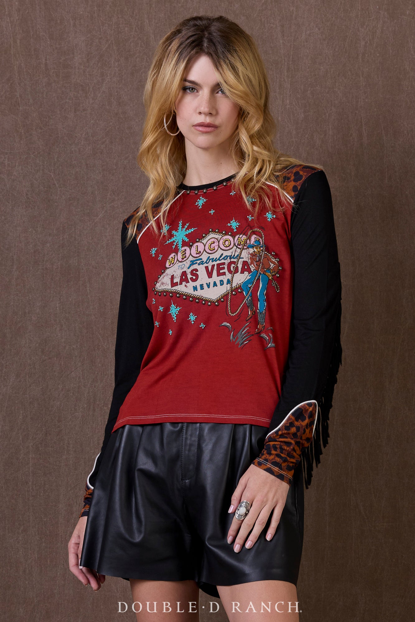 This is our first year really trying our hand out in Vegas for NFR, and we’re going all in! We couldn’t resist making a commemorative top that has a little sparkle and sass combined with cool, casually wearability. The vibrant red is complemented by contrasting black sleeves and accents of animal print, the bodice is imprinted with the famous Vegas welcome sign and embellished with studding and sparkle, and it’s finished with fringed sleeves for that little touch of twang.