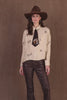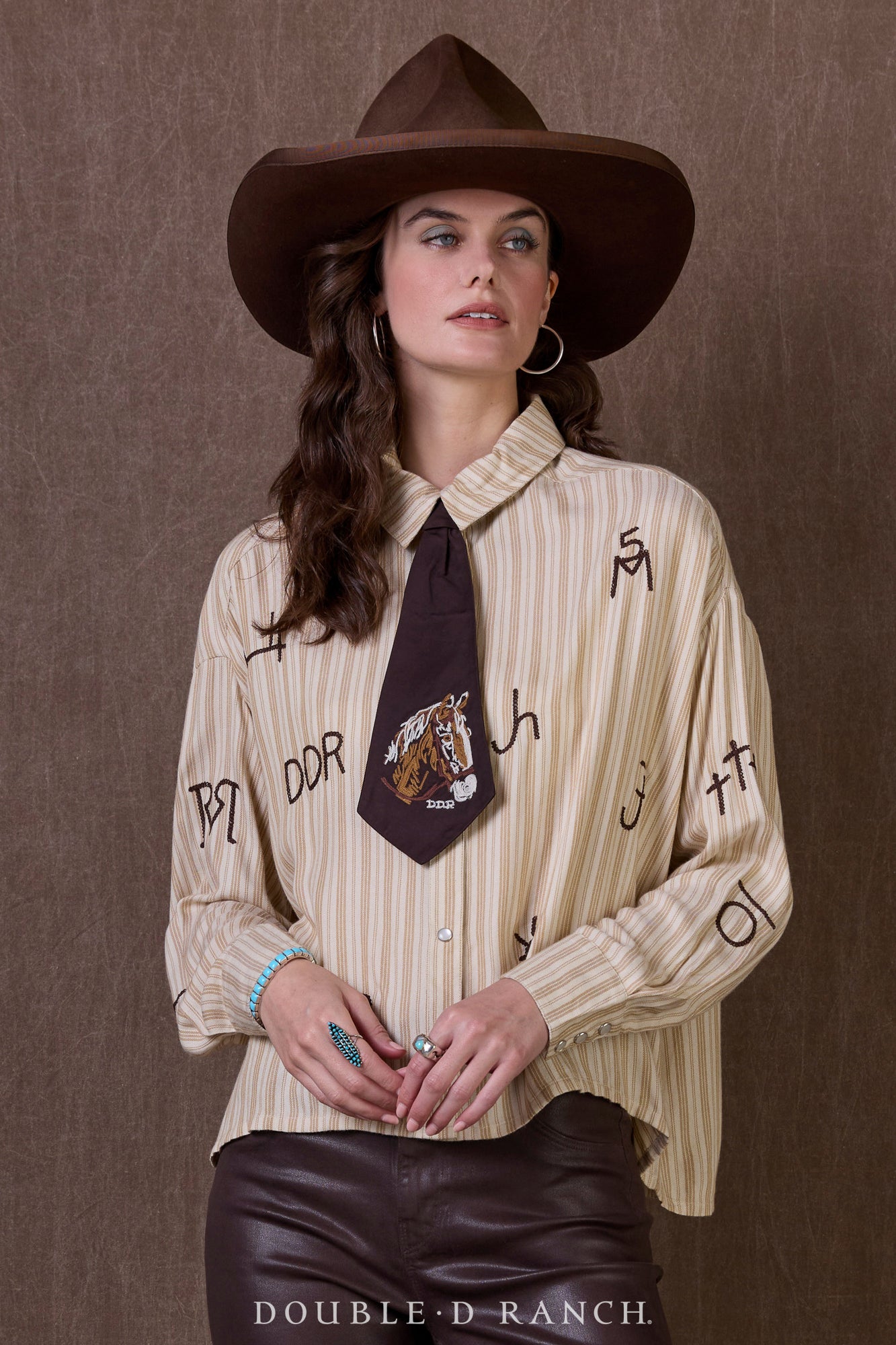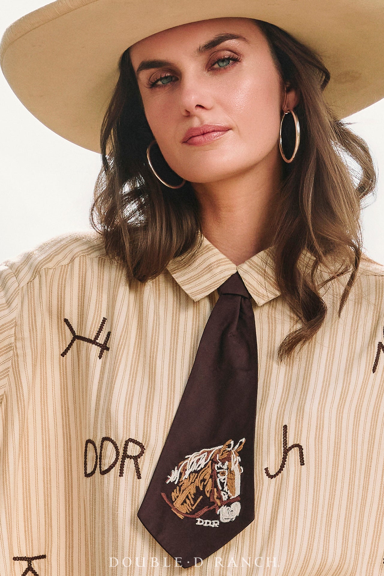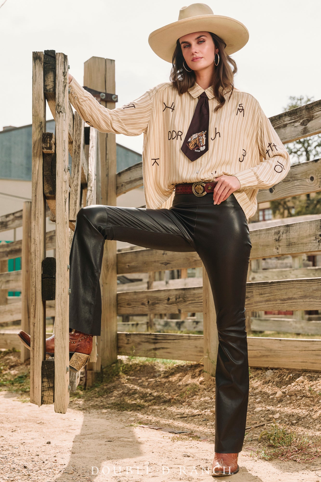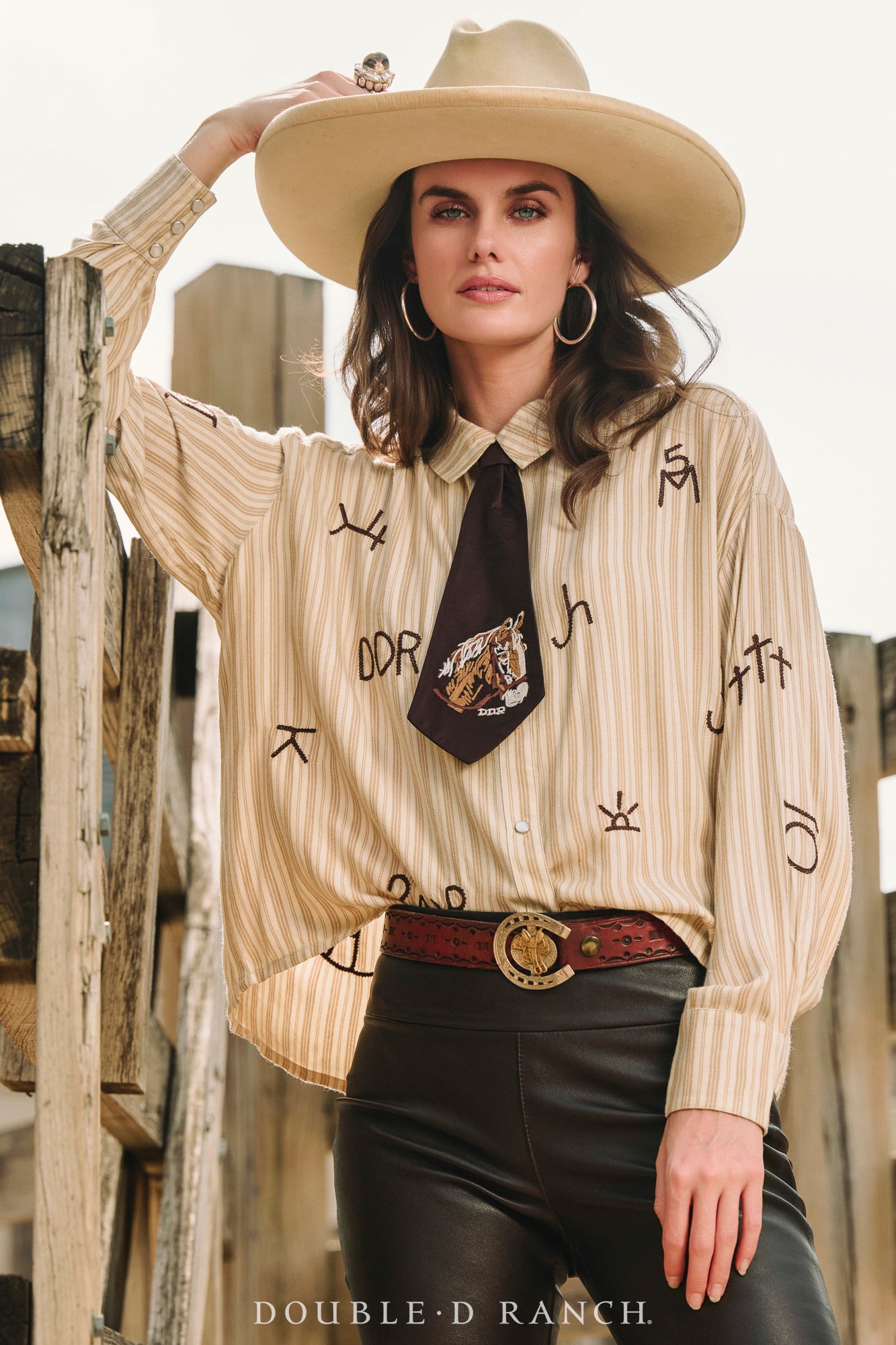 This fun blouse makes a strong statement with subtle striping, embroidered brands, sleek horn snaps, and a whimsical wide (removable) tie emblazoned with a horse head. It’s chic and unique with vintage Hollywood cowboy vibes!