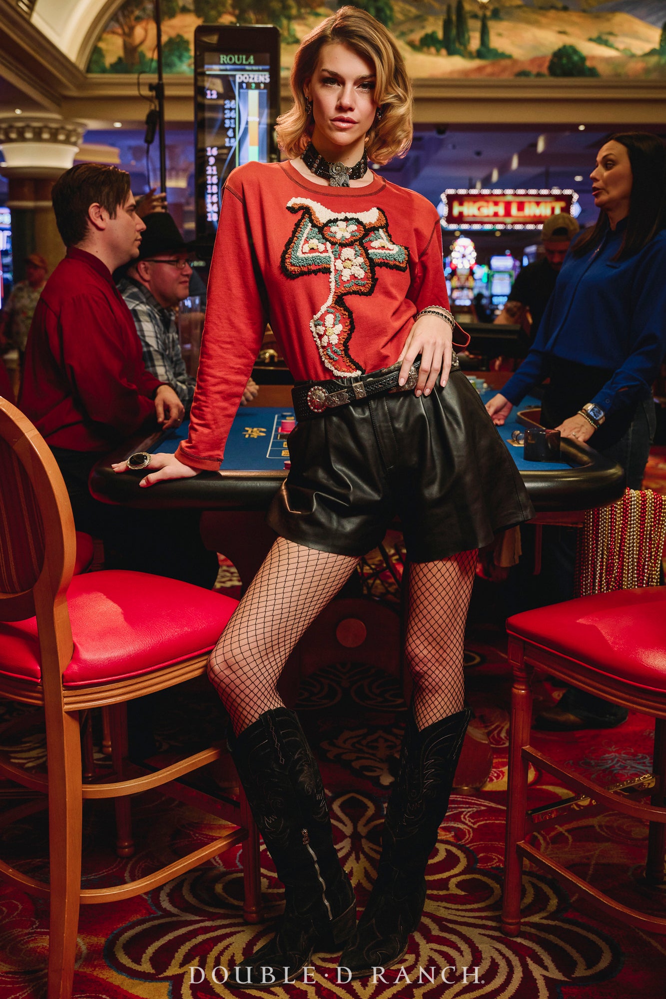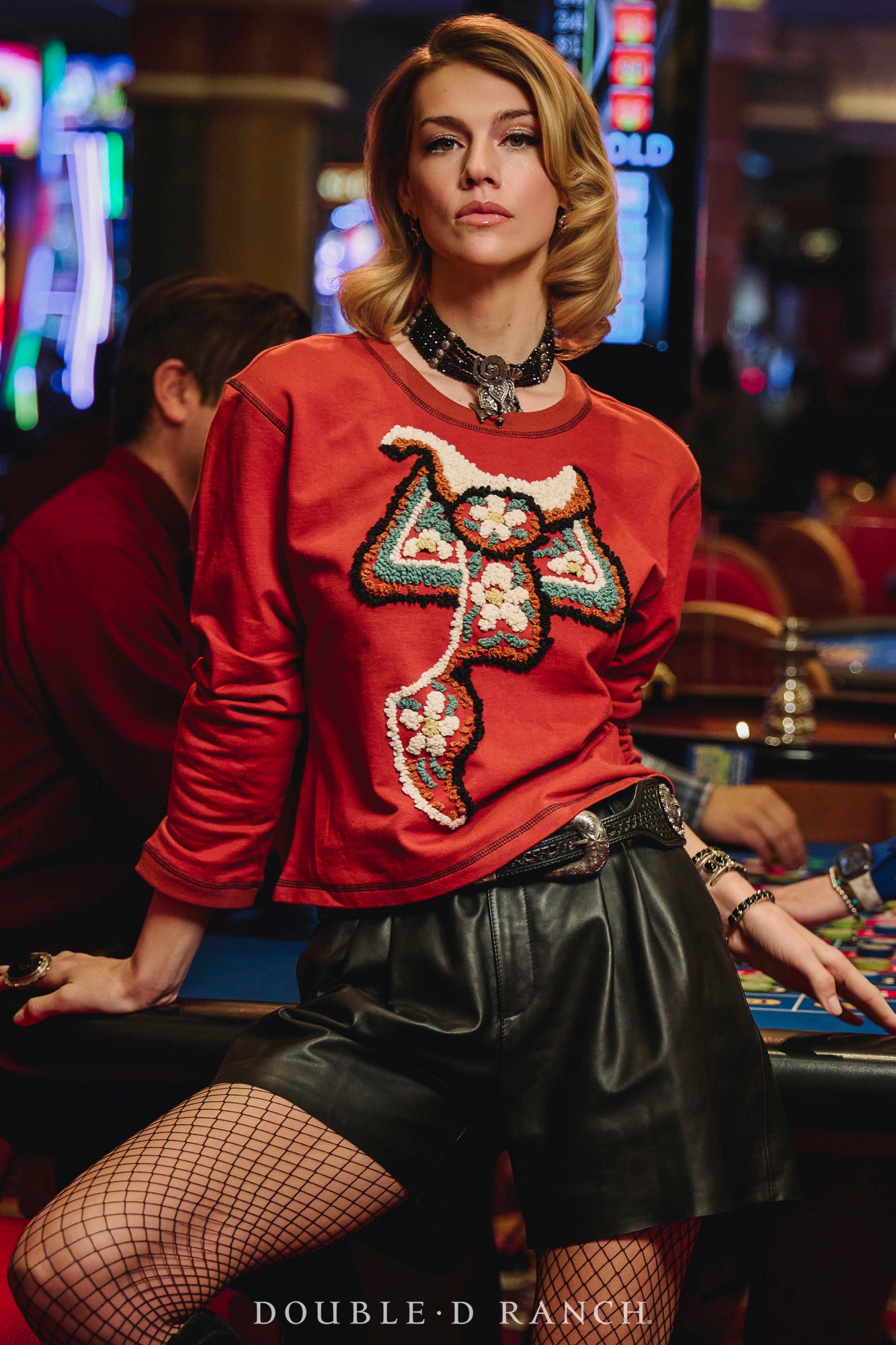 We’ve always been believers that ‘everyday’ is not the same as ‘ordinary’ and that just because something is casual doesn’t mean it can’t be captivating. This top has quickly gained traction as a fan favorite with its striking red hue, chic contrast stitching, and eye-catching terrycloth embroidery of a colorful floral saddle. Really, what’s not to love?