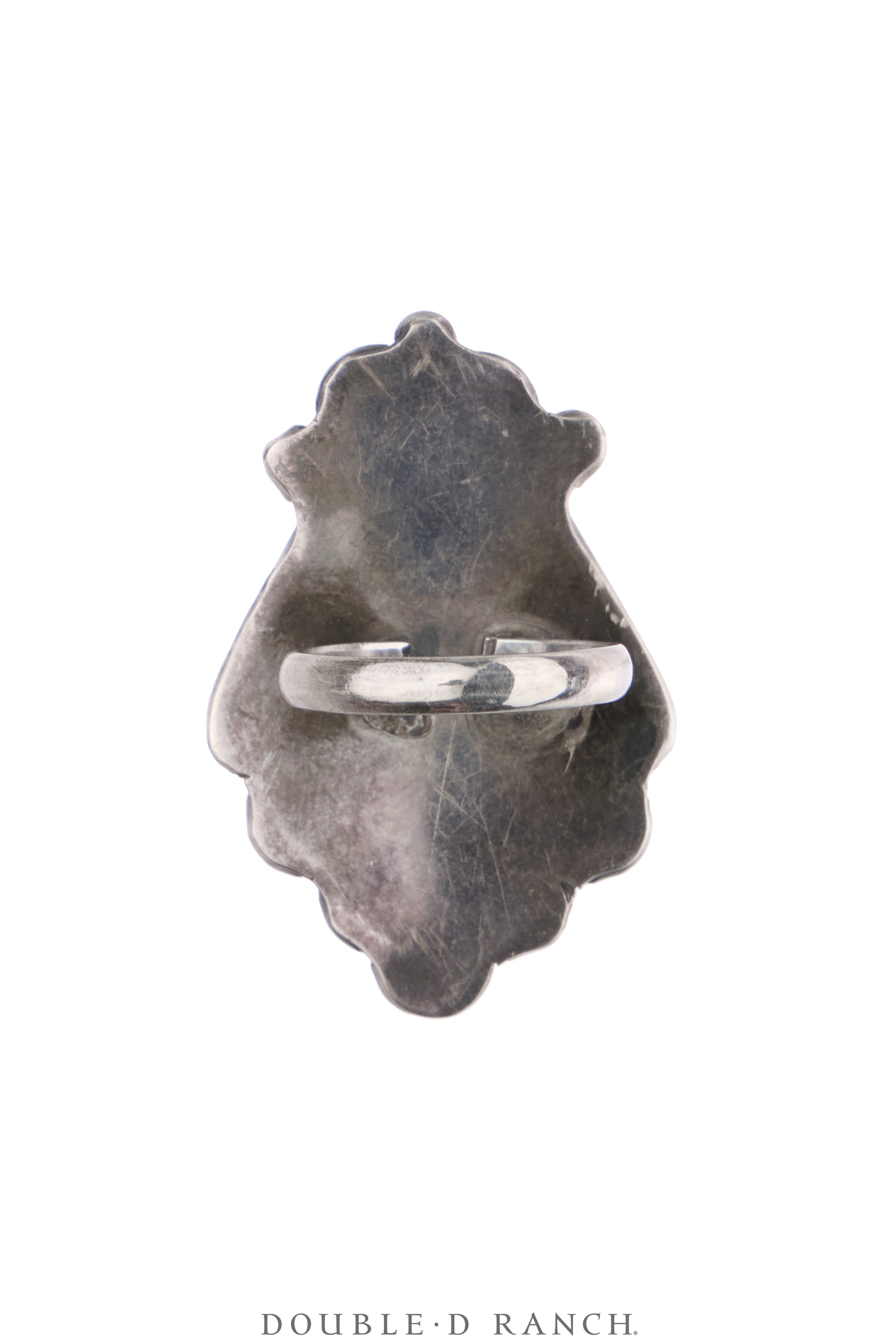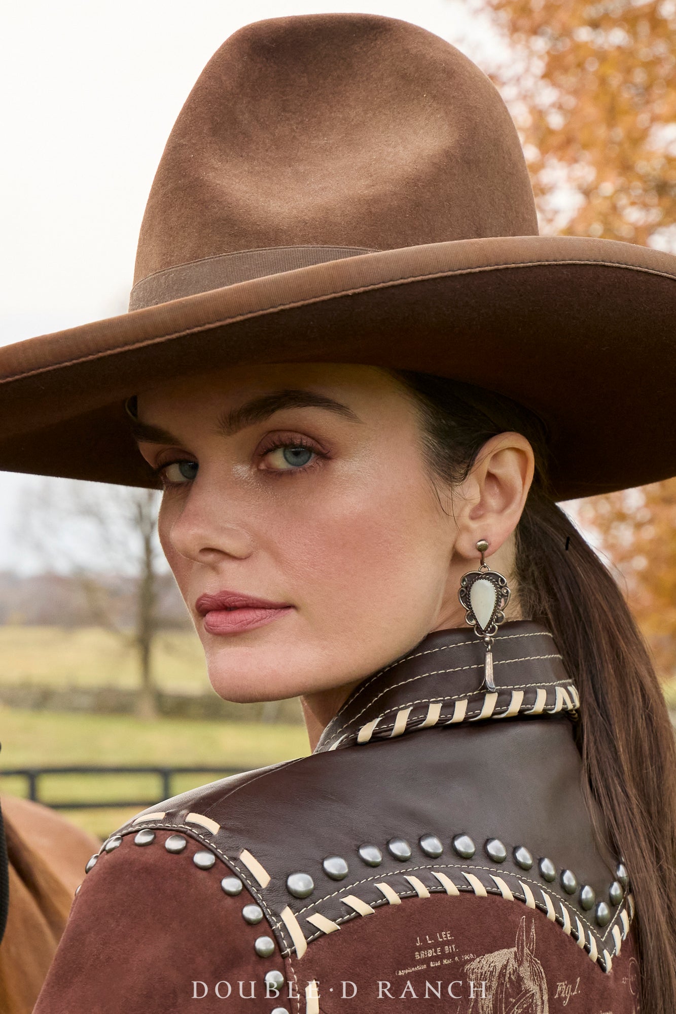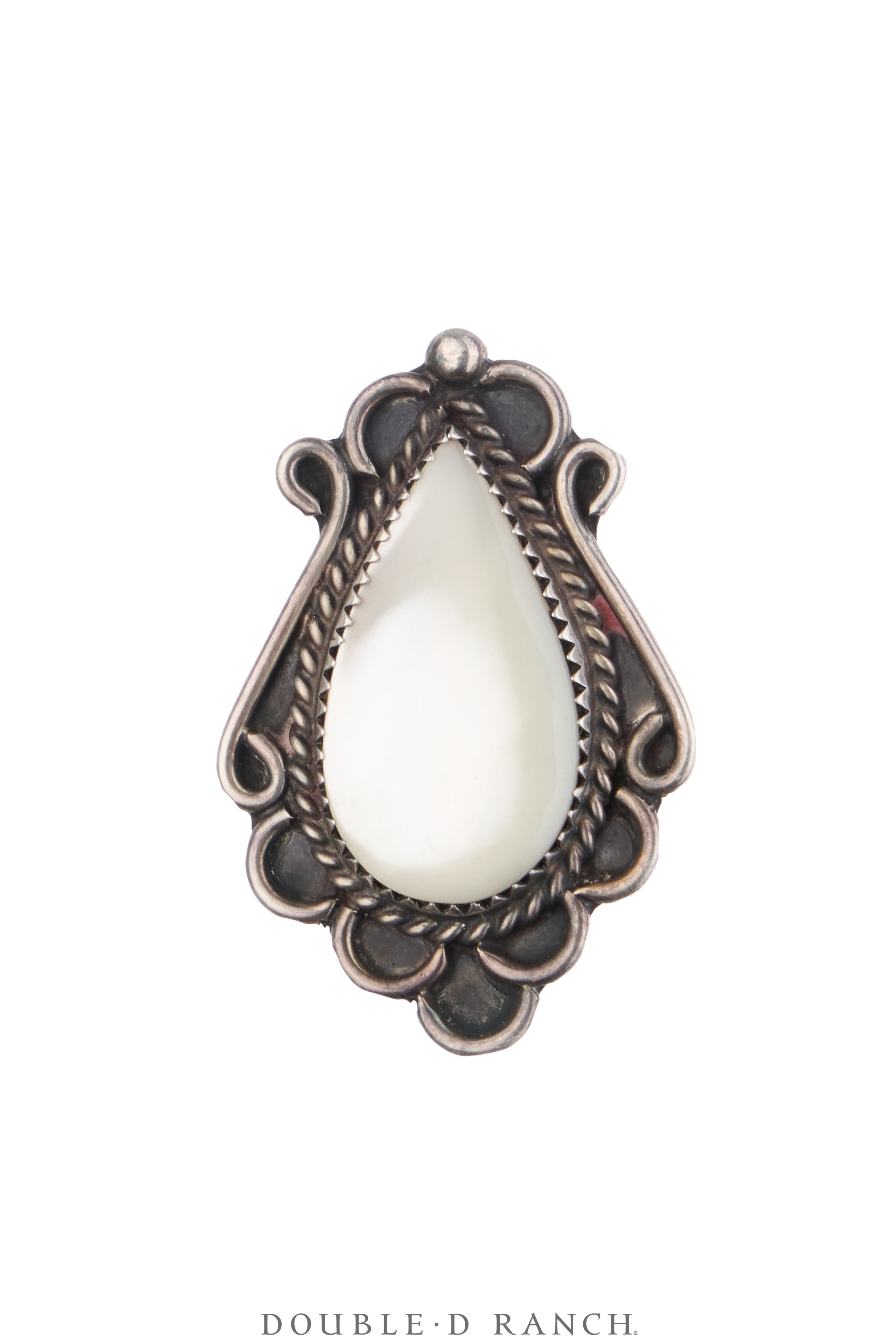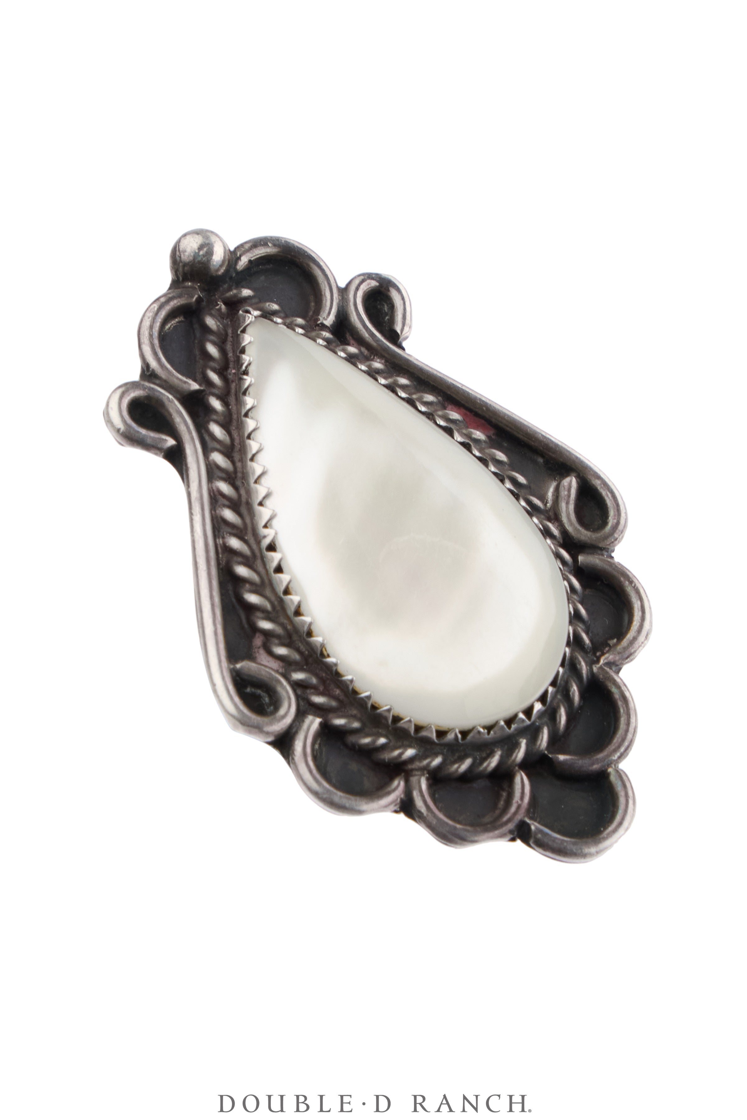 Elevate your collection with this exquisite vintage trio in a matching mother of pearl motif. The squash blossom necklace is a double strand of desert pearls boasting 10 blossoms of teardrop MOP cabochons, set in ornate frames and finished with traditional sterling silver blossom tips, and finished with a 5-stone naja. The cuff is beautiful split-bar band adorned with a trio of similarly set stones, alternating in orientation for an eye-appeasing symmetry. And finally, the dangle earrings mimic the blossoms from the necklace set on dainty french wire hooks.