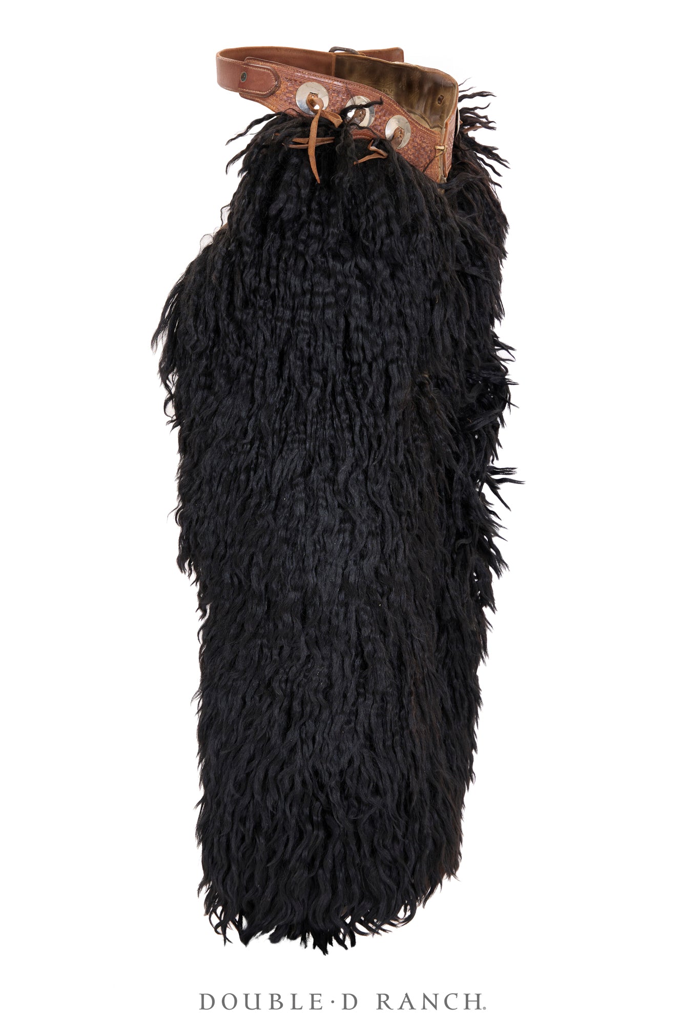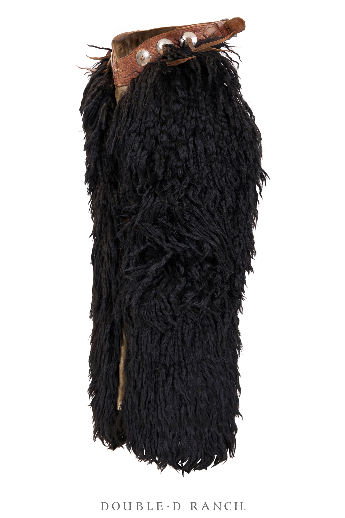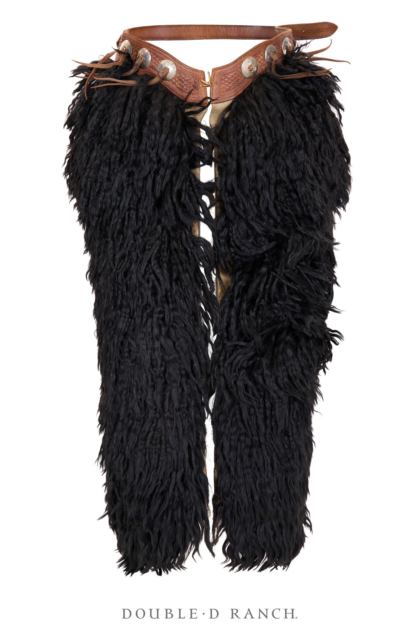 Y’all, these chaps are absolutely incredible. These vintage 1920’s chaps, crafted by Blake Miller, feature a basket-weave hand-tooled leather, six nickel silver conchos, and, of course, their signature statement black angora wooly legs. They’re incredible, unique, and impossible to ignore – stunning finds for the true collector!