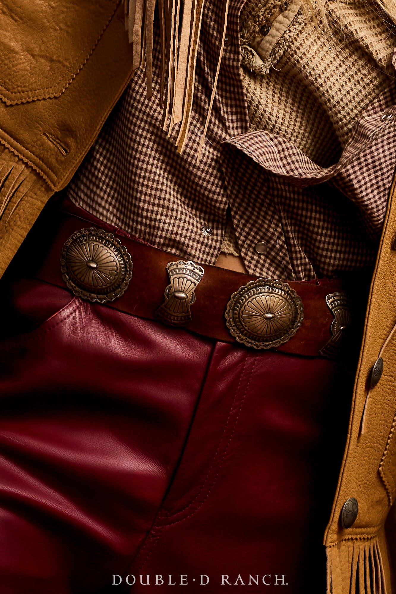 You really can’t beat a classic concho belt when it comes to southwestern style. This Second Phase style belt features heavily stamped scalloped conchos with a single bump out in the center, alternated by stamped butterfly spacers on a simple leather strap. The statement buckle is a bold silver piece with a double mustache design and stamping throughout. A striking silverwork piece that will have no trouble making a wonderful statement.