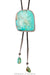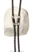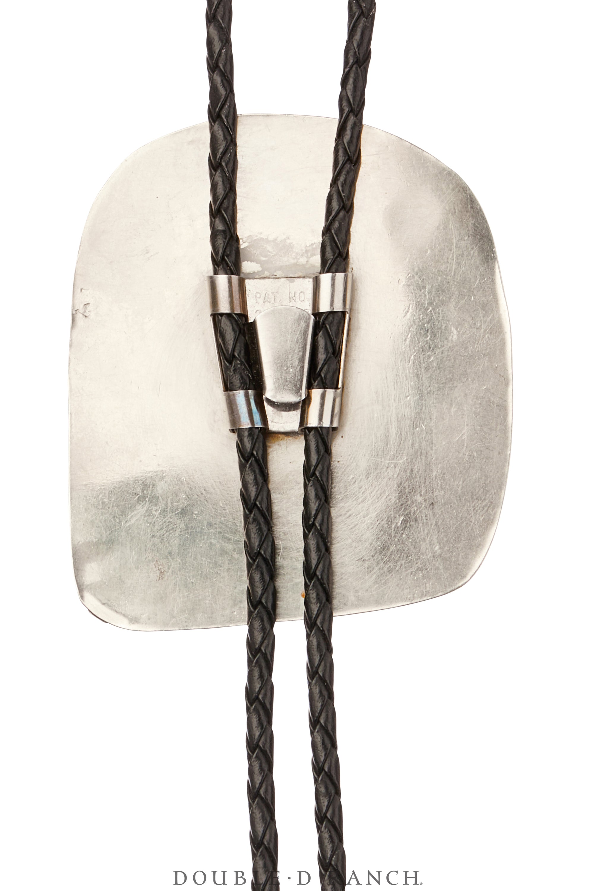 Big, bold, and beautiful are three words that describe this vintage Navajo bolo tie. The bolo itself is a large, unique shaped turquoise stone set in a simple bezel with a sterling silver rope border. Its color is a light baby blue with large mineral deposits throughout the stone. It has a tension clamp on the back to keep it in place on the black braided bolo cord that has sterling silver aiguillettes and round turquoise stone dangles on its ends. Bring big bold beauty to your style with this bolo.