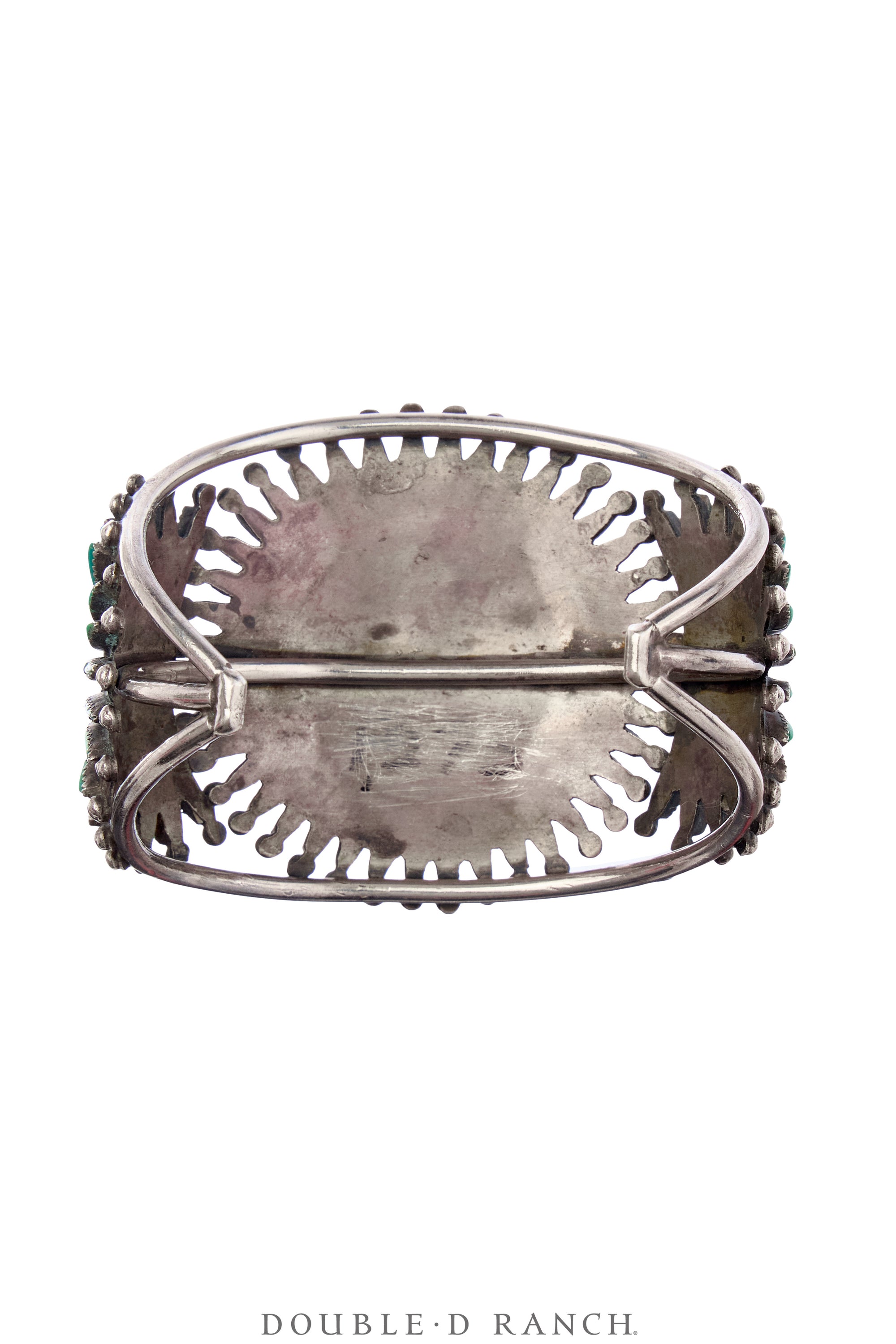 This is a statement cuff for the gal who really *gets* southwestern jewelry. Dating back to the 1940s era, this intricate cluster cuff (likely Zuni) exemplifies the lapidary skill of the artisans of the day. The classic radial cluster features a remarkably uniform arrangement of tiny needlepoint and snake eye turquoise stones, accented by sterling silver rope and drop details on a wide split-bar band. This is a collector’s cuff, a forever love!