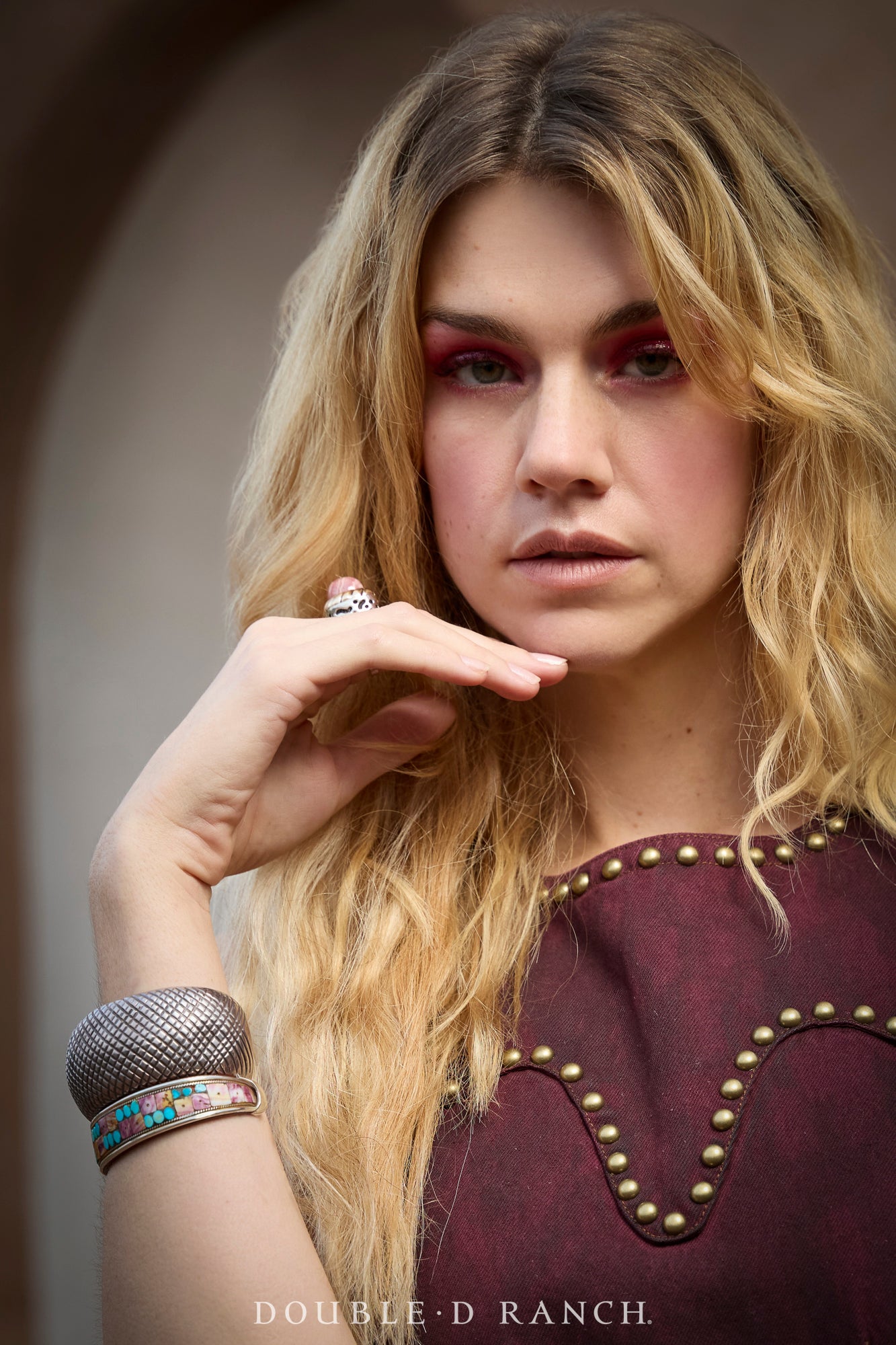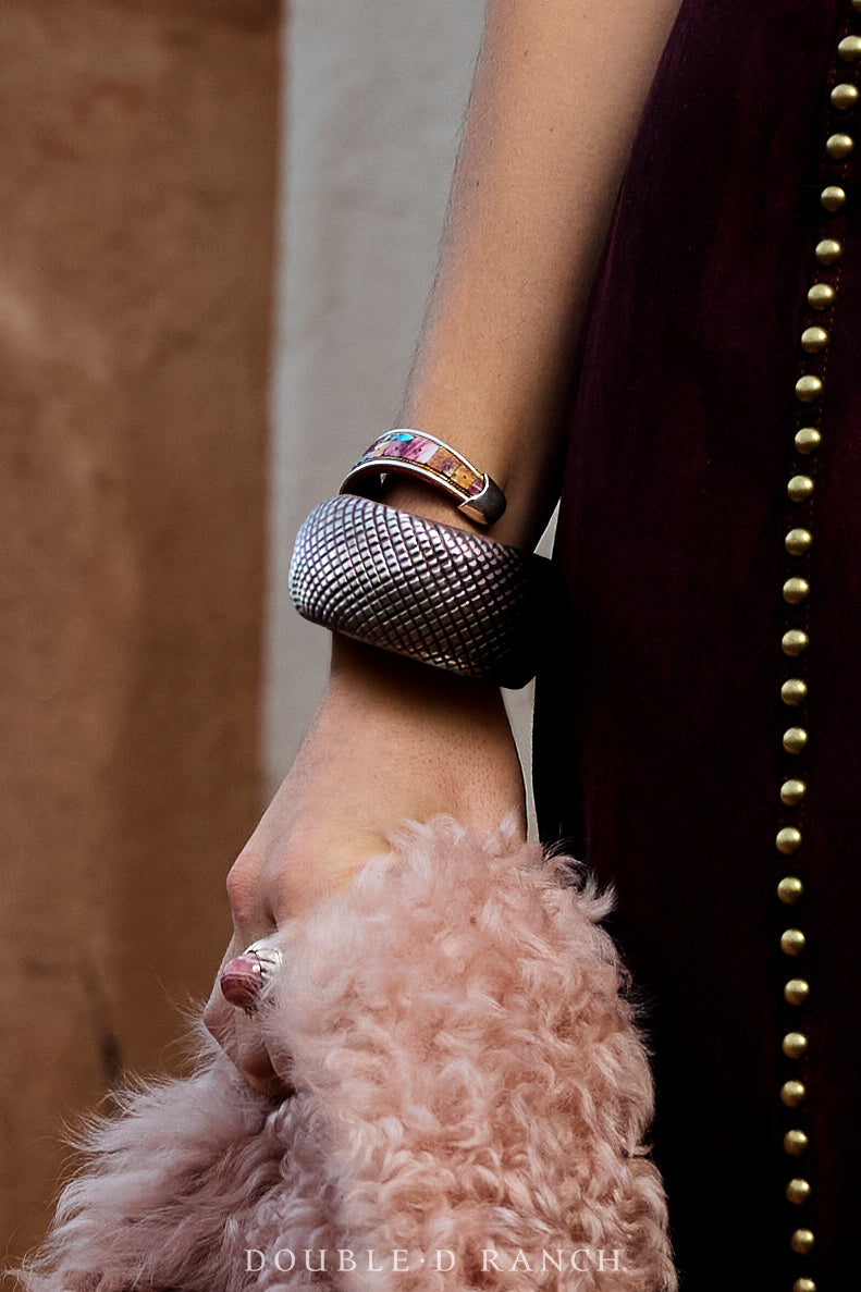 This bold, beautiful cuff is a vintage creation by renowned Navajo artisan, the late Orville Tsinnie. The dimensional domed cuff is a substantial statement piece, embellished with an intricately etched geometric crosshatch pattern. A timeless piece to add some shine to your stack.