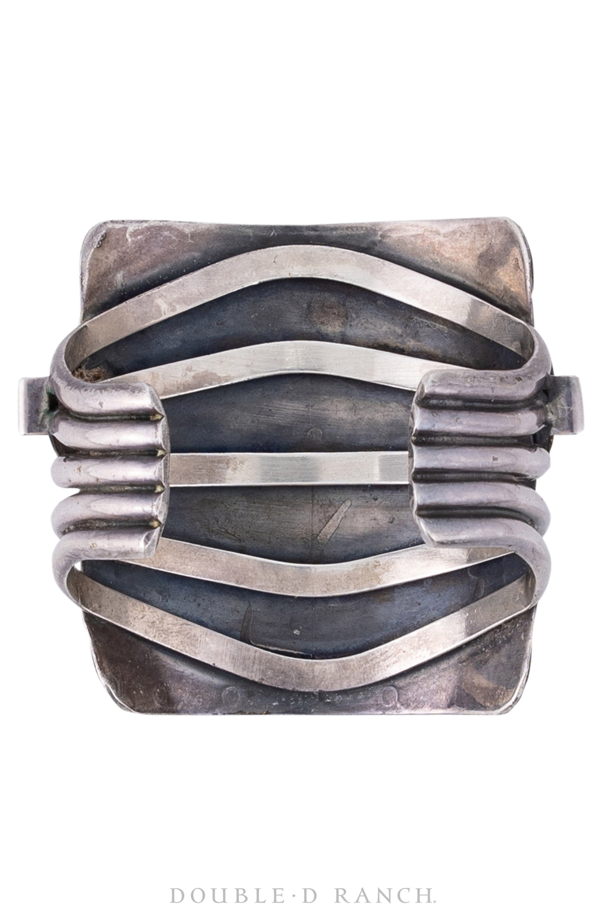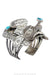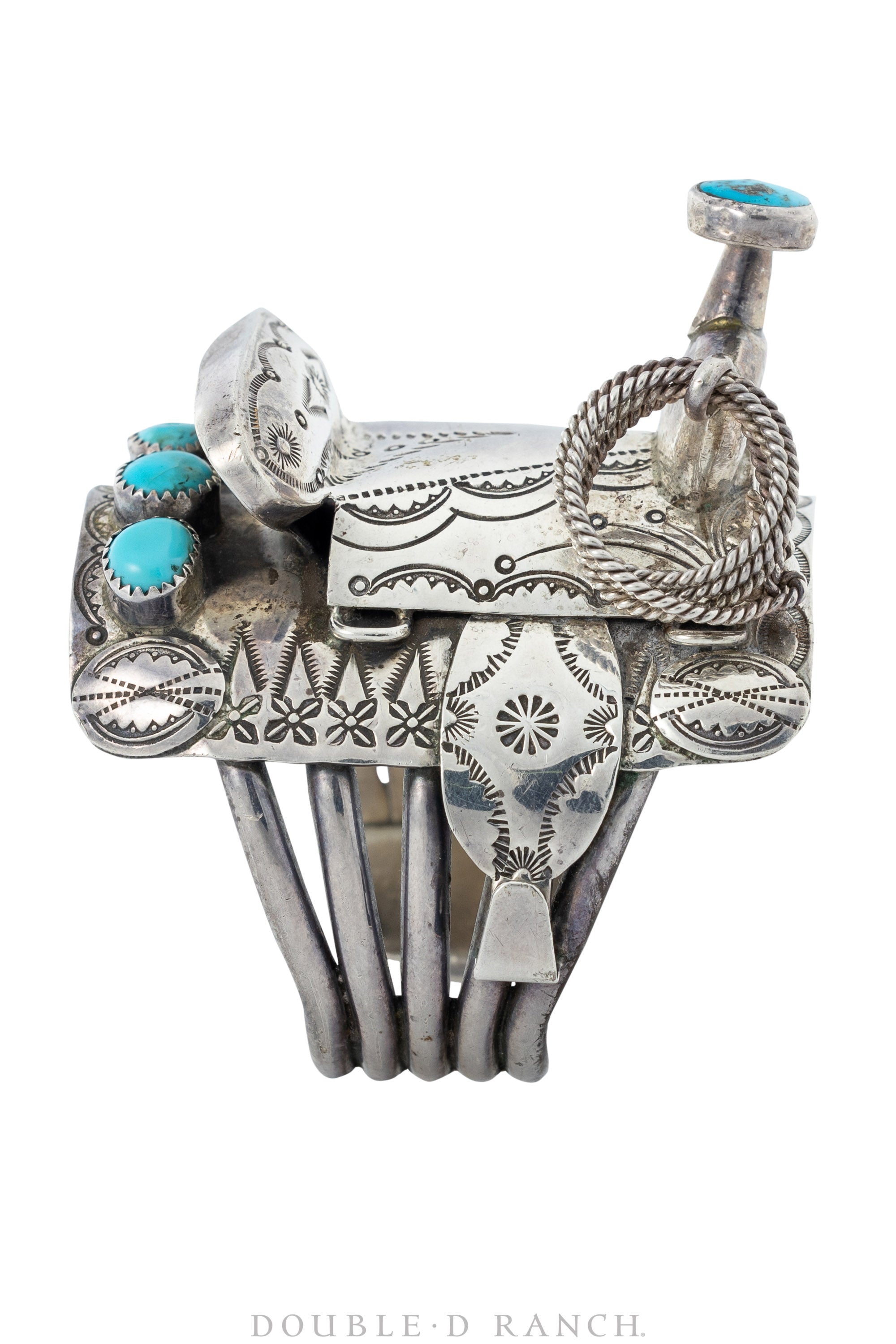 This wearable work of art is absolutely impossible to ignore. The dimensional saddle structure crafted in sterling silver is intricately embellished with stampwork and details such as stirrups, a saddle horn, and even a sterling silver lasso. It’s adorned with a handful of tiny turquoise stones for that added pop of personality and color. The wide split-bar band tapers to the back for a sleek, snug fit of this one-of-a-kind statement piece