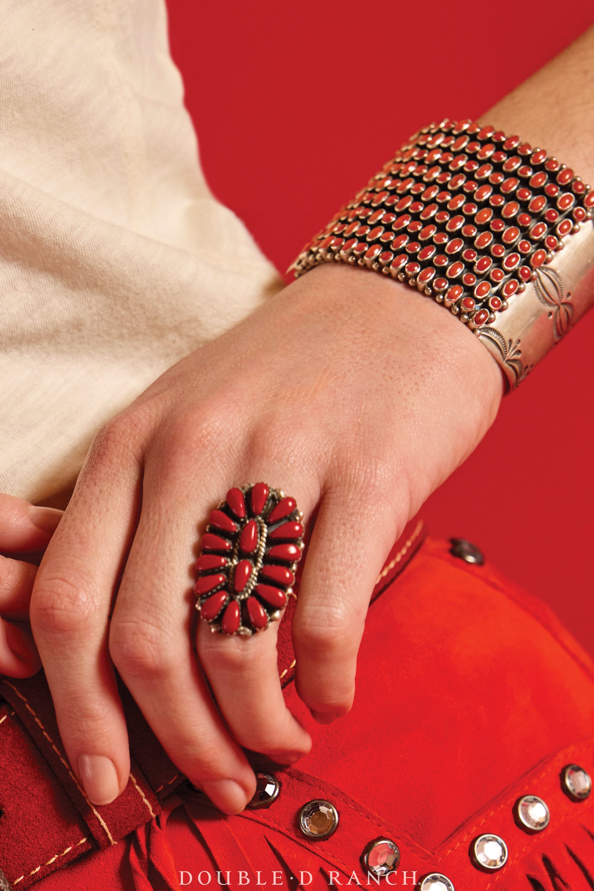 For the person that likes to be a statement and wear one at the same time, this cuff is for you. This remarkable vintage cuff crafted by Dee Nez, features dozens of rounded-oval coral stones set in tiny simple bezels arranged in nine striking rows and accented with sterling silver drops. Absolutely exceptional, a true statement piece.