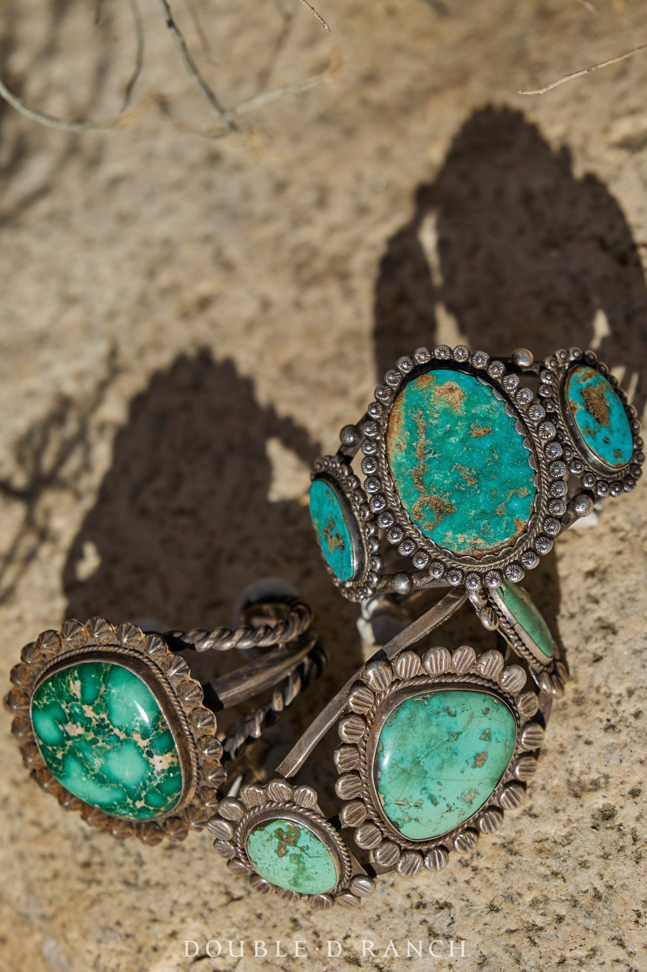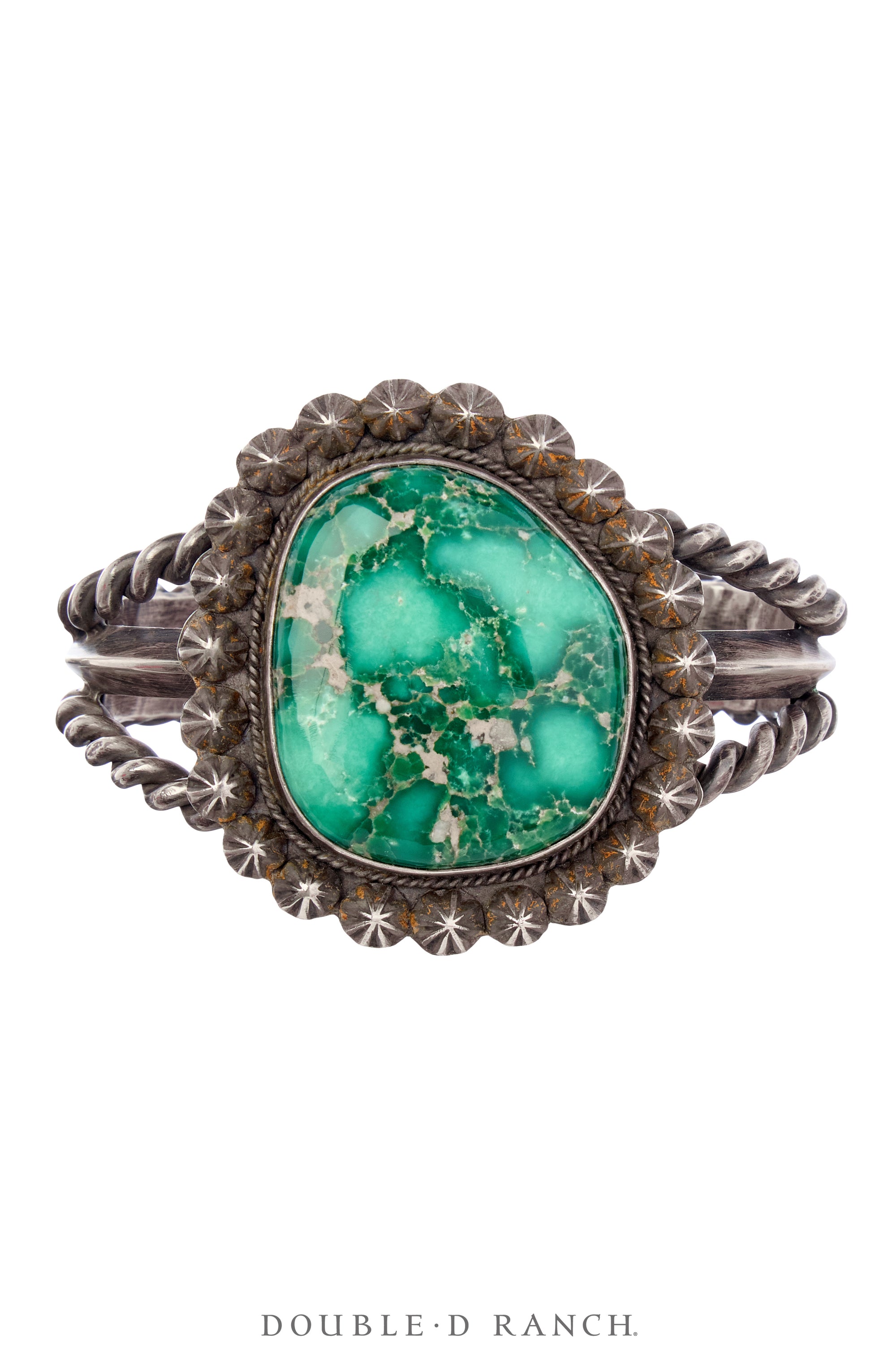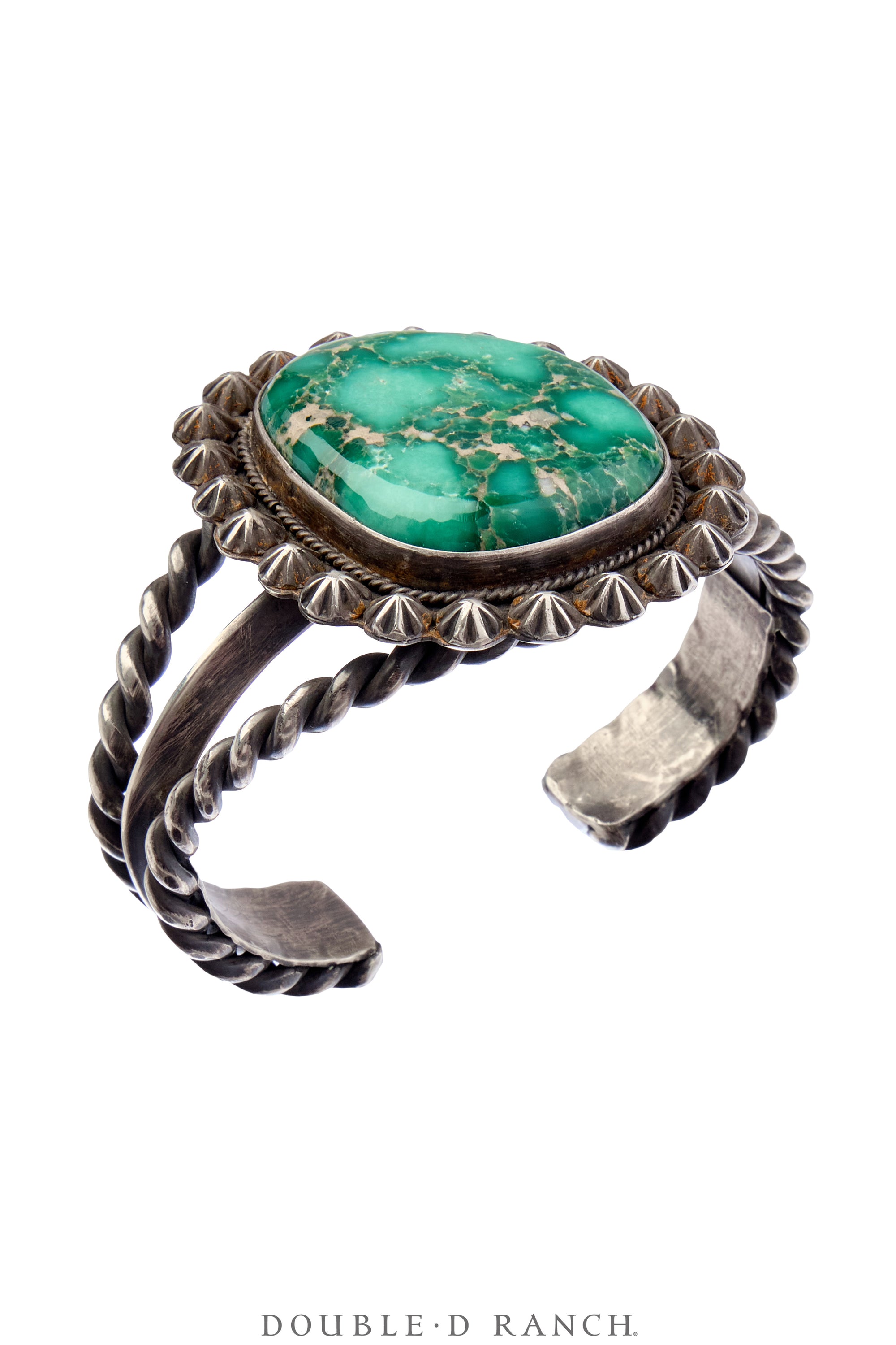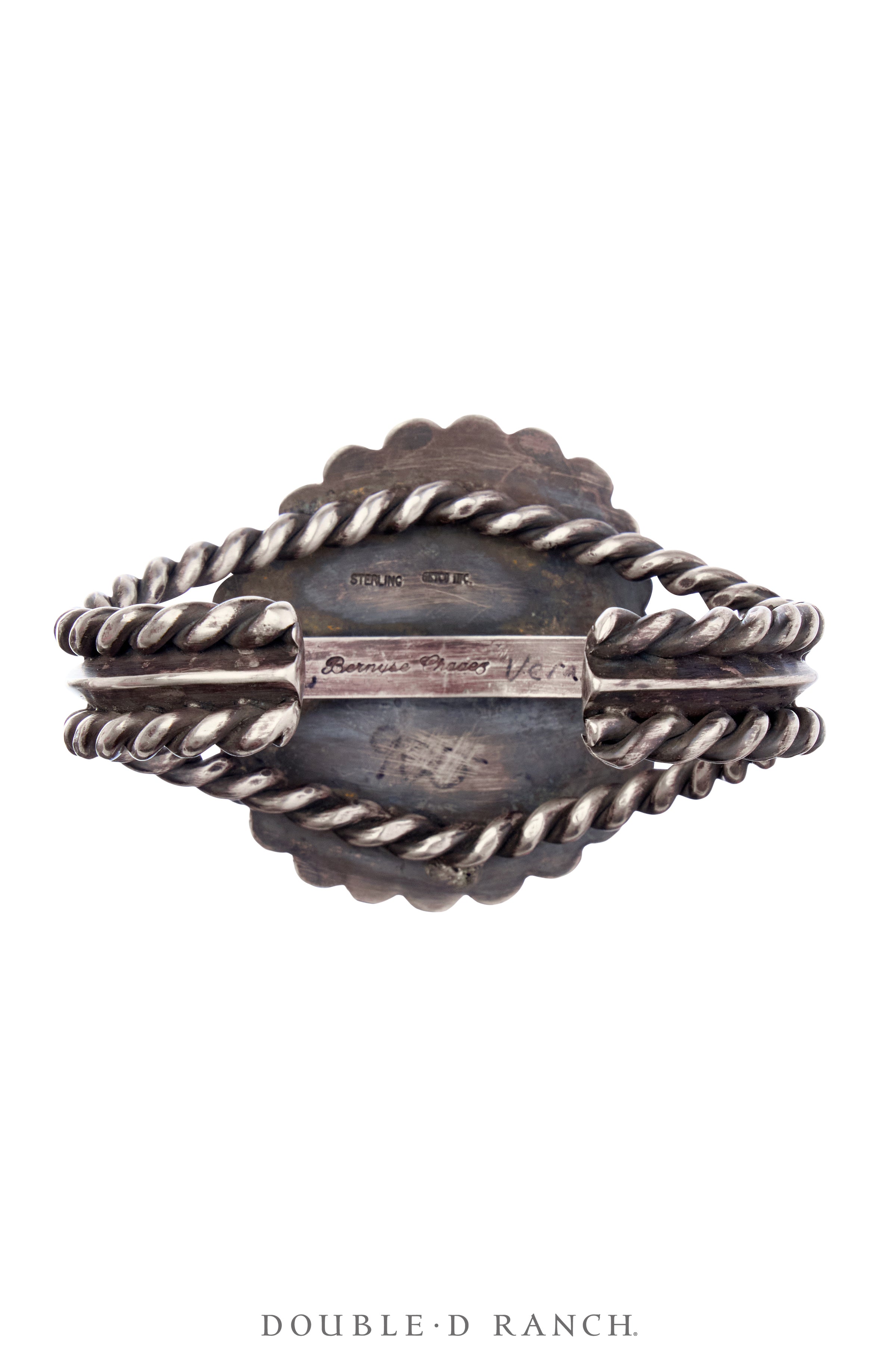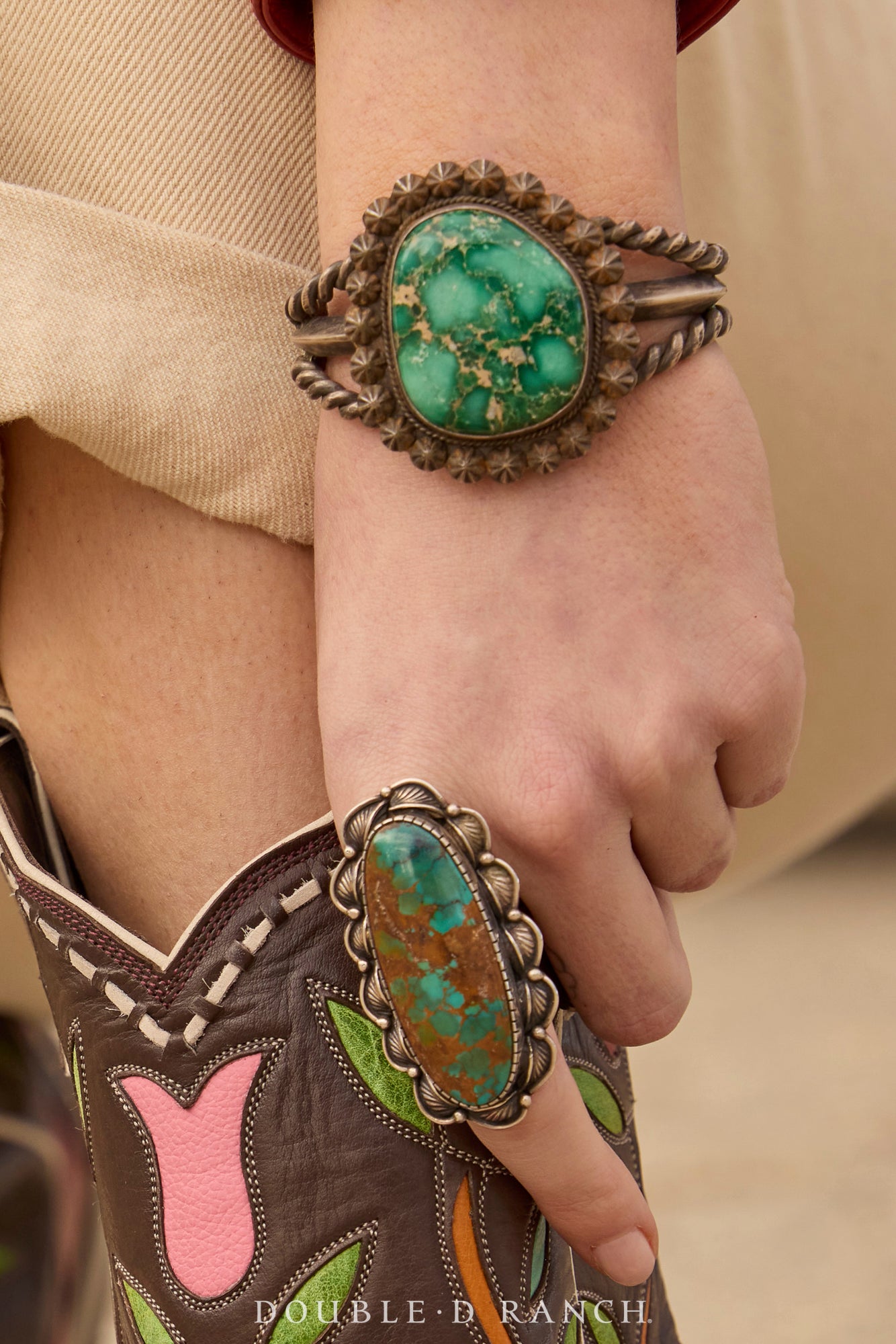 Just sit in awe of this beauty for a second – it’s hard to take your eyes off it! The focal point, of course, is that stunning 72ct specimen stone of Broken Arrow veracite. Artisan Bernyse Chavez fashioned the mesmerizing stone into a chic cuff on a split-bar twisted rope silver band and framed it with fluted silver drops. It’s upscale and elegant with distinct southwestern style. A masterpiece.