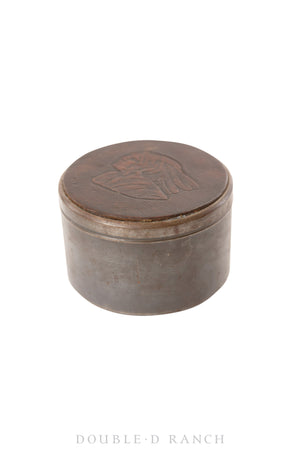 One of the best things is finding those vintage pieces that you know hold so much history. They have a story that you wish you could know every detail of but it is always fun to make them up too. The old west cowboys needed something to keep their tobacco in so it wouldn’t dry out and tins like these did the job perfectly. This one is a cylinder shape made from base metal. Atop the lid is a leather piece detailed with a tooled Native American head. Pieces like these are the perfect accent in any room.