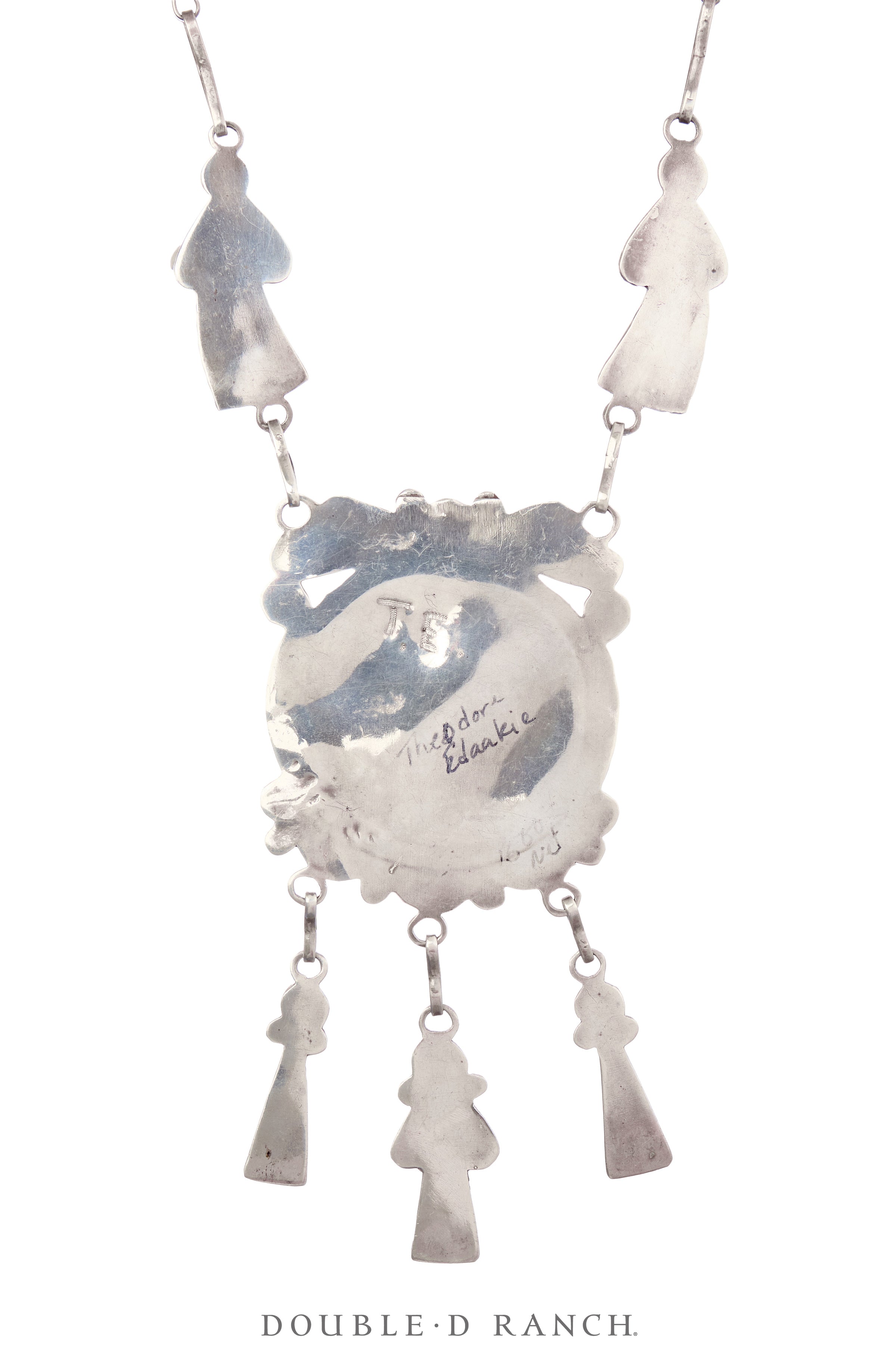 This remarkable collector’s piece is a vintage work crafted by the late Theodore Edaakie, a renowned and highly sought after Zuni artisan. His signature style of uniform channel inlay is featured here, depicting a traditional hummingbird on the pendant and complementing accents and dangles, crafted using stones of turquoise, coral, milky quartz, shell, abalone, and serpentine. Truly stunning, eye-catching, and timeless.