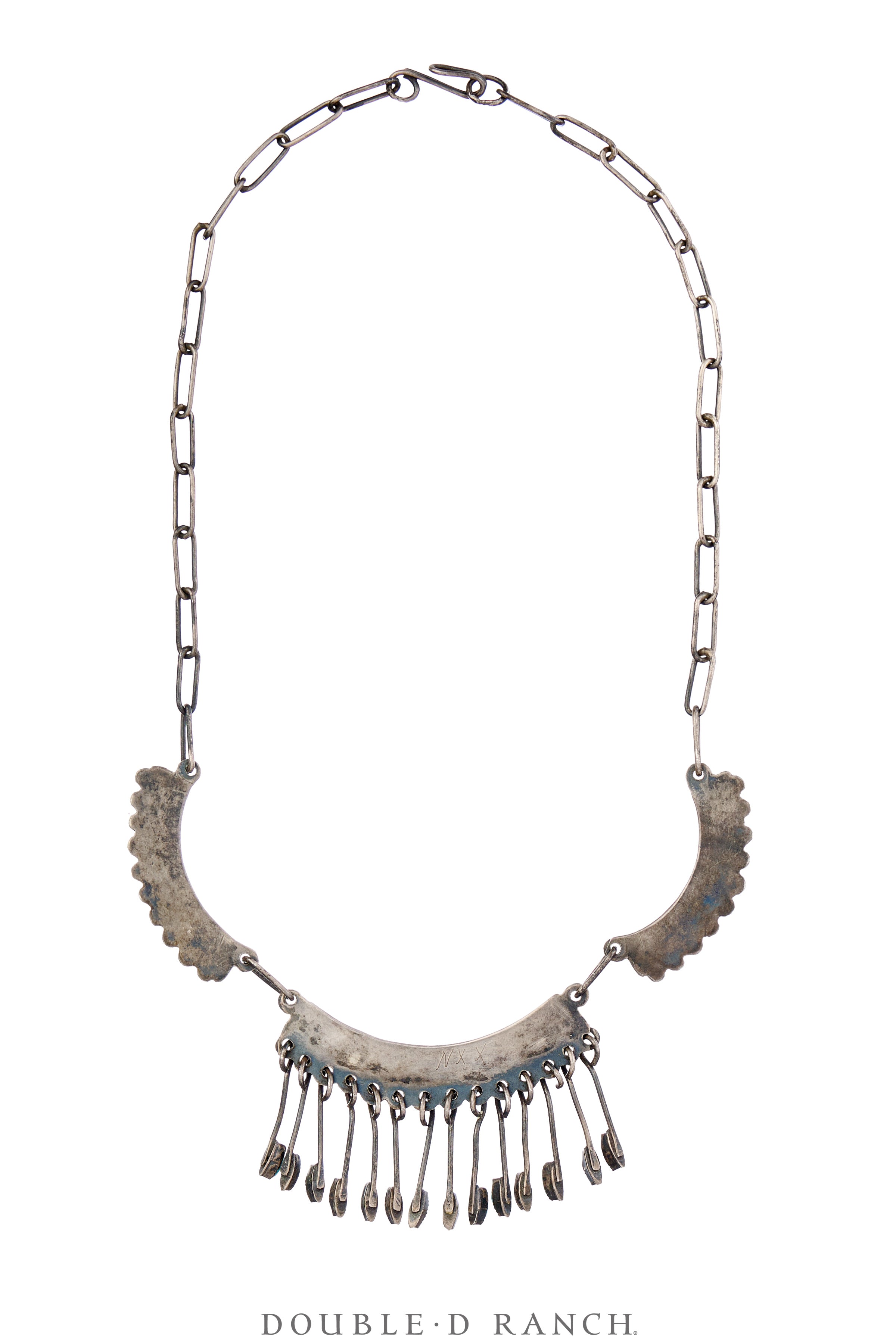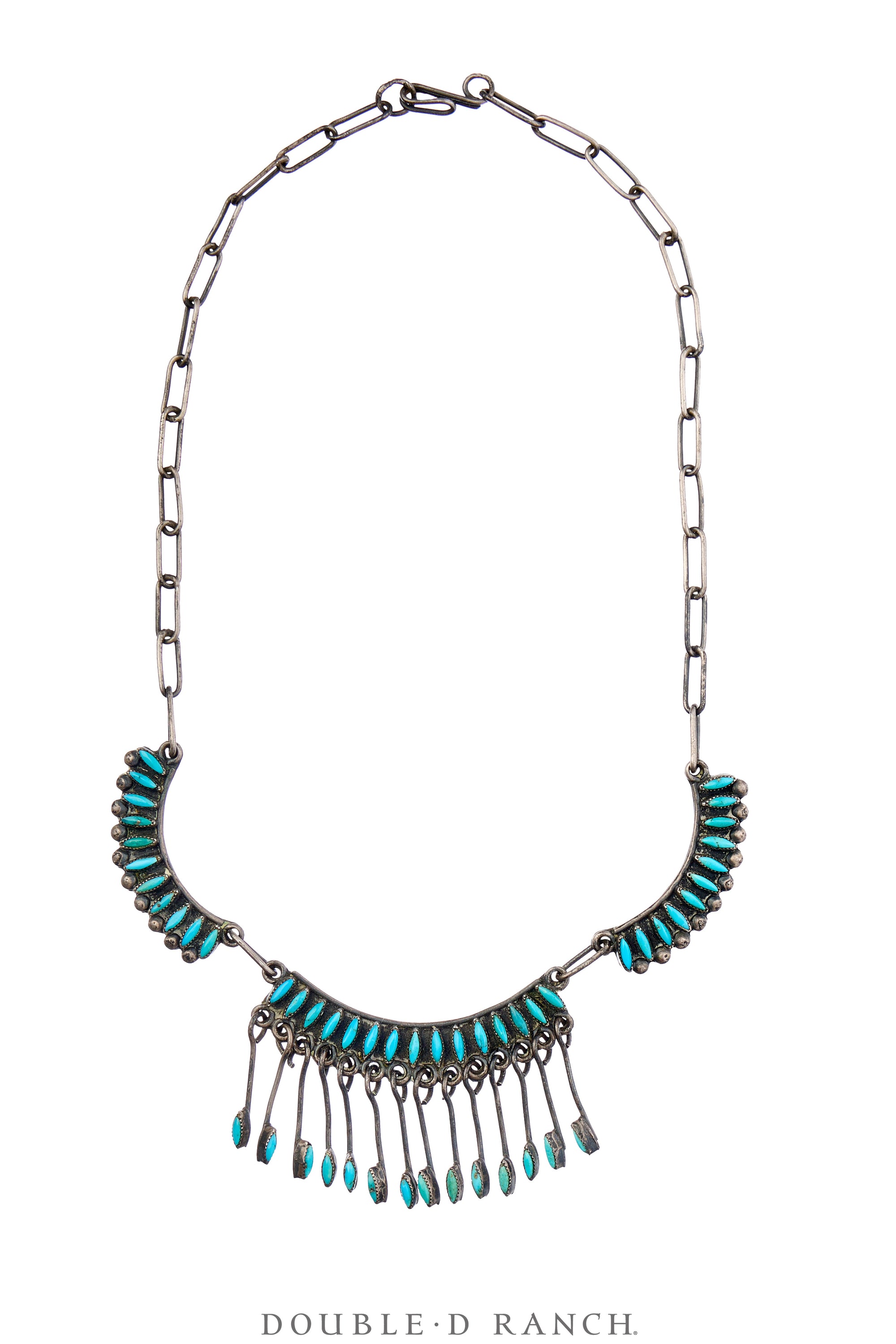 This vintage princess necklace is a unique piece boasting a trio of hinged arches adorned with needlepoint turquoise stones adorned with sterling silver accents. The central bar features a dangling series of 14 sterling silver and turquoise paddles that give it some fun movement. A pretty piece for your southwestern jewelry stash!