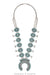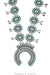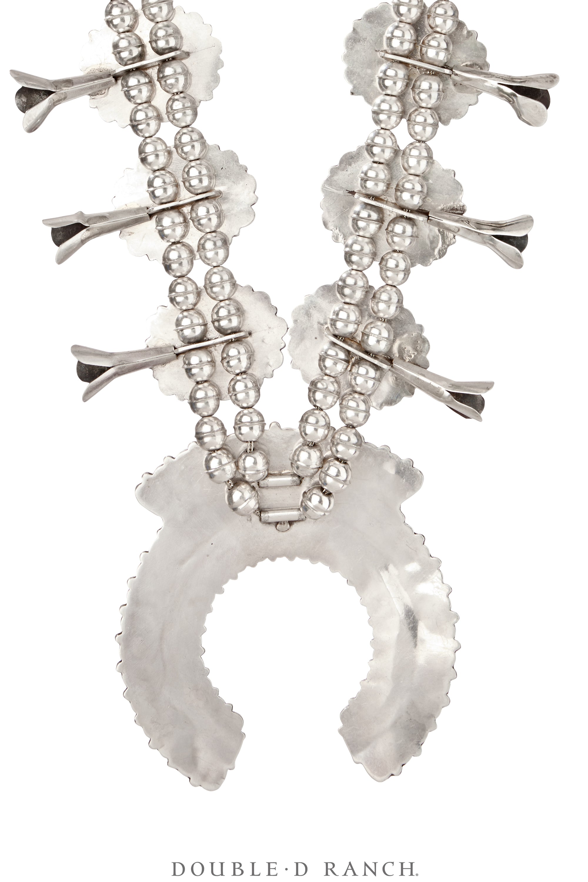 This awe-inspiring vintage necklace is a treasure to be cherished. Attributed to legendary artisan Fannie Ondelacy, this traditional-style squash blossom begins on a double-strand of desert pearls, boasting 12 cluster blossoms of turquoise stones. A large naja featuring matching turquoise stones and intricate sterling silver work of drops and twist wire throughout finishes the piece. Each of the beautiful stones features its own unique matrix, and the craftsmanship is top tier. It has classic charm and highly collectible qualities, definitely the kind of piece that becomes a family heirloom.