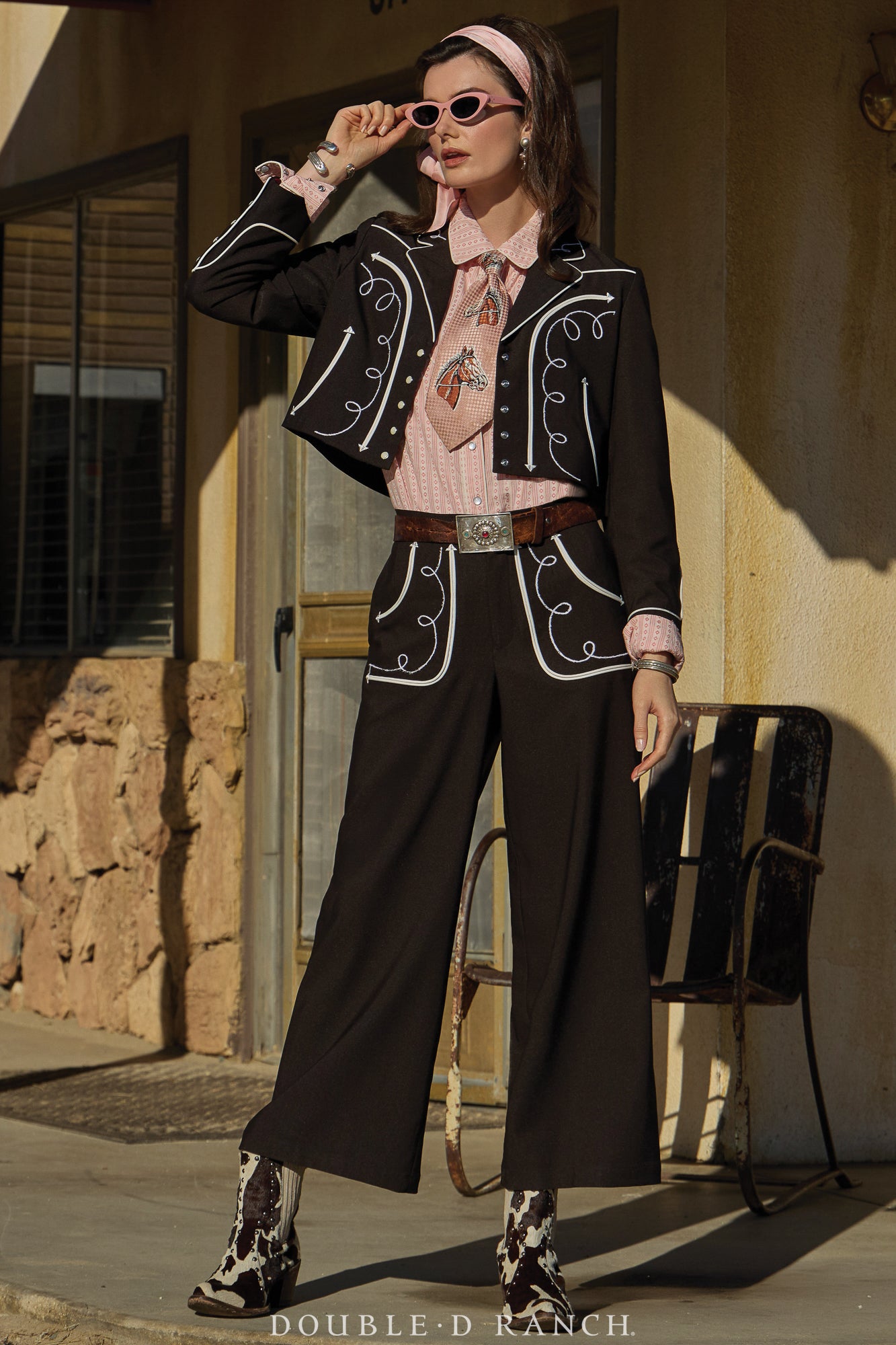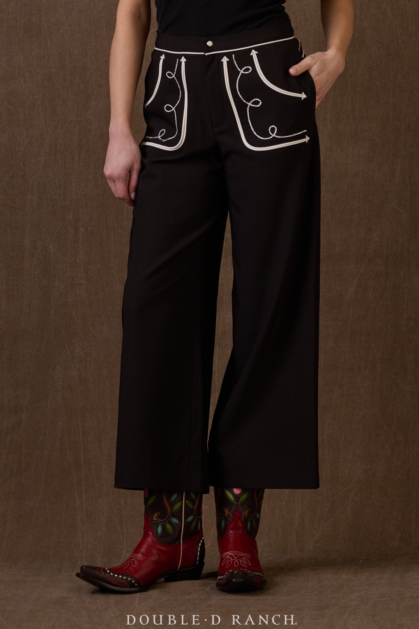 Chic meets whimsical in this charming pant. The cropped wide leg silhouette brings an ultra-modern feel that’s balanced by the retro embellishments of white contrasting welts and coil embroidery against the rich ‘bronco’ brown. It’s a stunning statement piece all on its own, but it’s power-suit perfection paired with the Rag Proper Jacket!