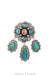 This fun piece is a darling dangle pin crafted using intricate and ornate sterling silver stampwork, adorned with cabochons of turquoise and opal with silver drop details, and complemented by a trio of turquoise-and-silver dangles. It has stunning craftsmanship, gorgeous color, and fun movement!