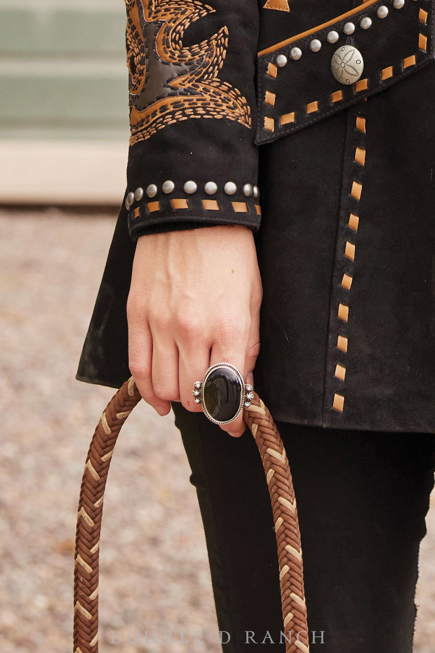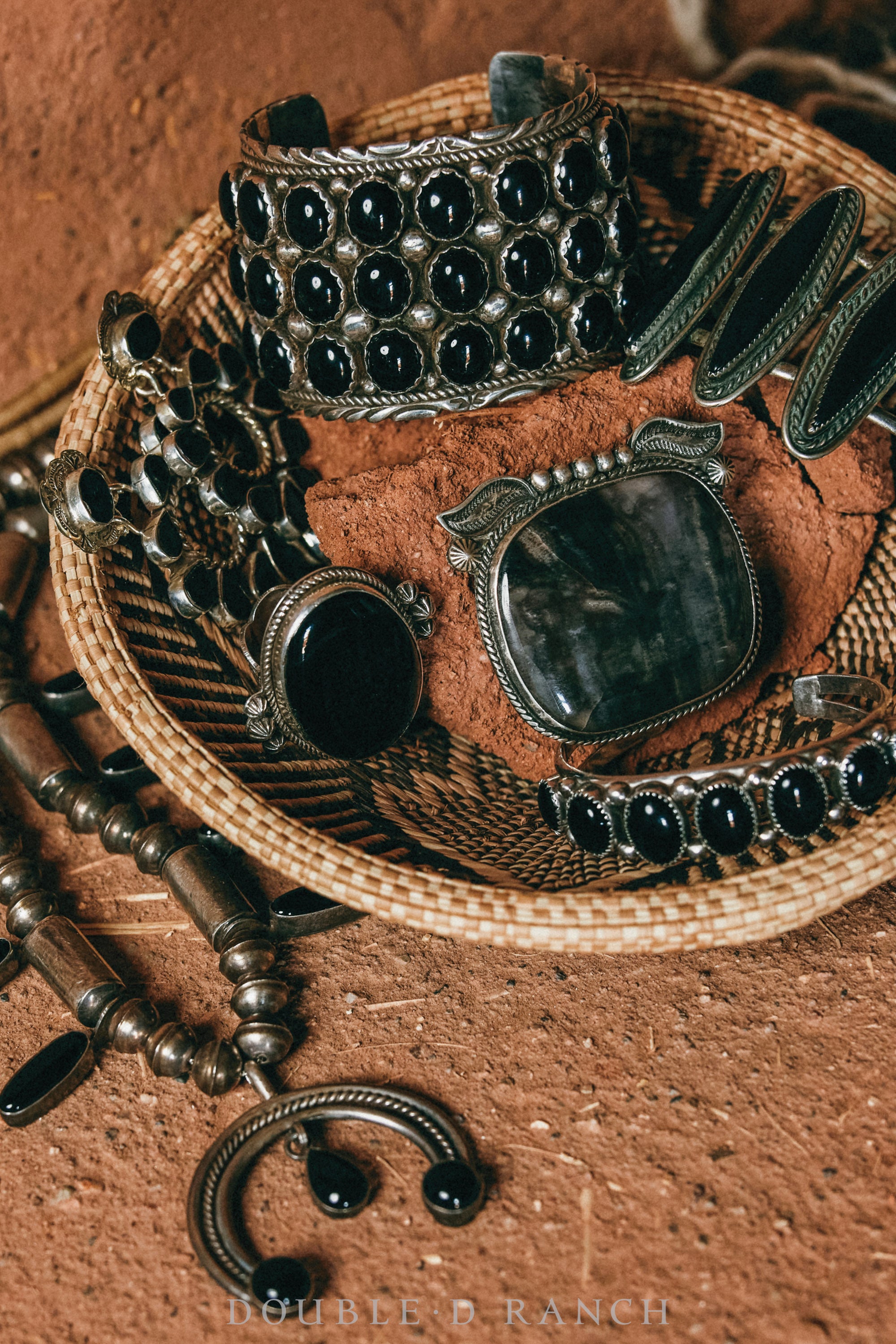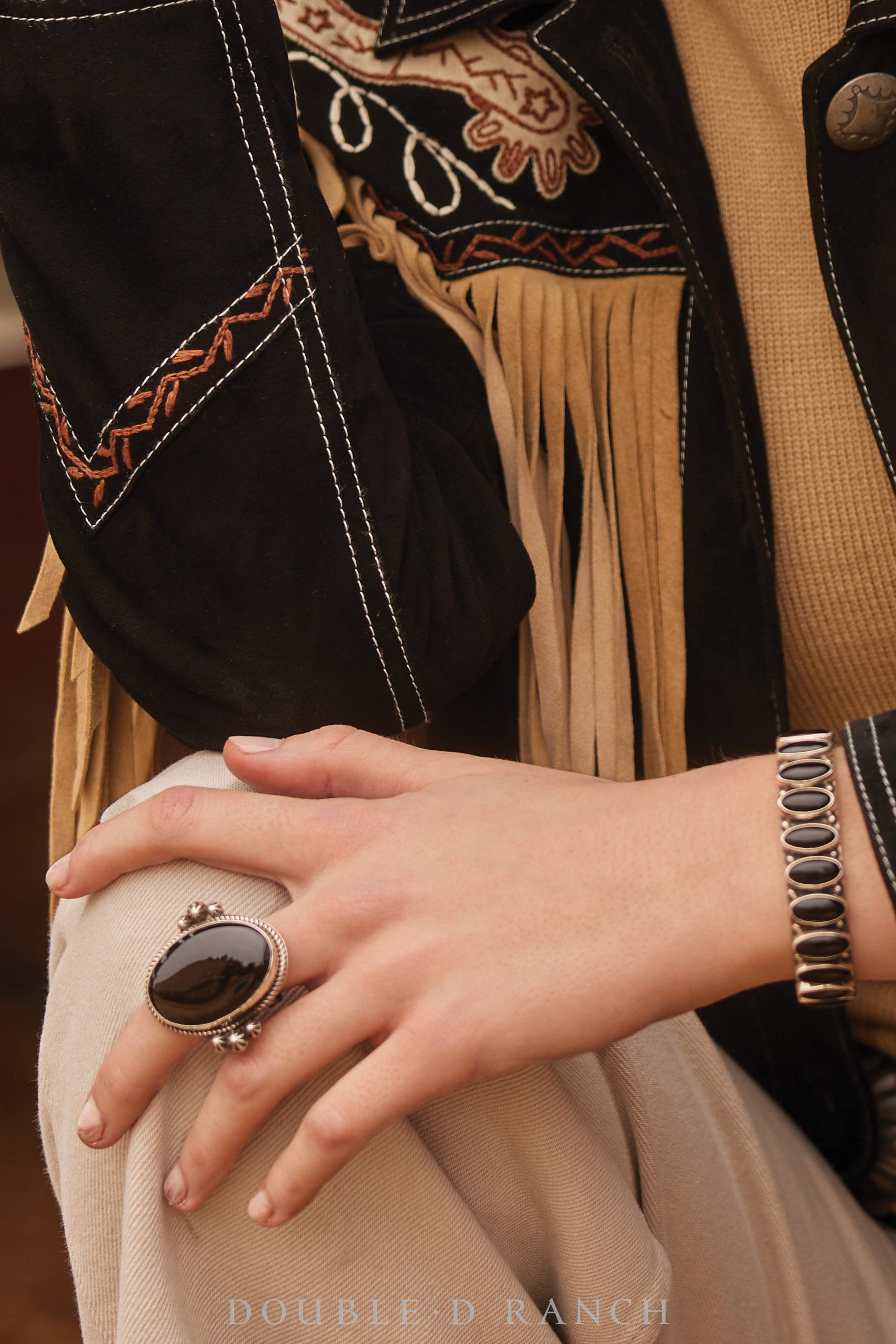 Crafted by talented Southwest jewelry artisan Freddie Maloney, this stunning statement ring features a big bold black onyx cabochon set in a simple sterling silver bezel, framed with tiny twist wire detailing and accented with a trio of fluted drops on each side. It’s a bold beauty, and black onyx is said to possess the power of positive energy -- something we could all use!