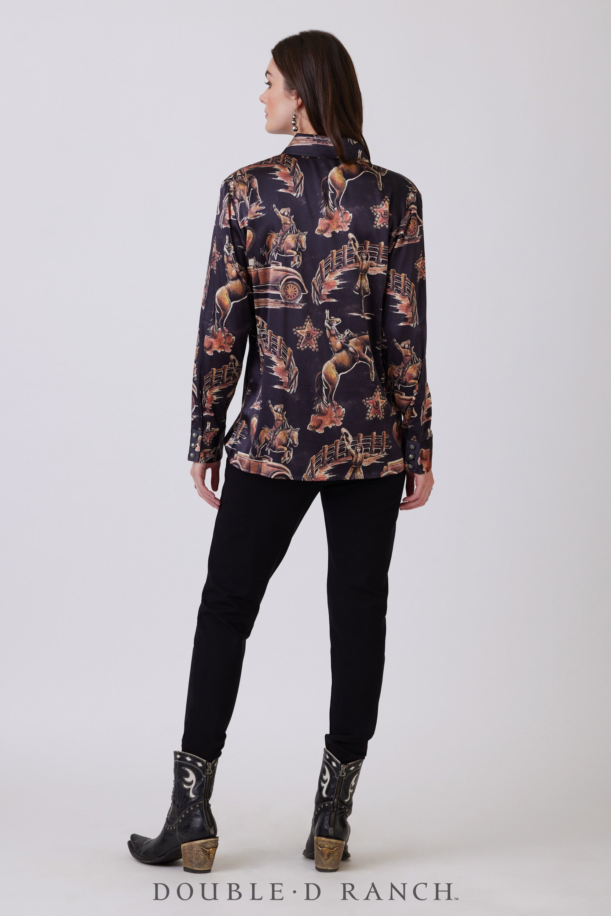 We immersed ourselves in the Cowgirl Hall of Fame and absorbed inspiration from its images to create this cowgirl collage print, boasting things like a bronc-back cowgirl, a sheriff’s star, and an old-fashioned fence line. We elevated its chic status by printing it on 100% silk and creating sleek silhouettes, like this ultra-elegant button-down blouse.