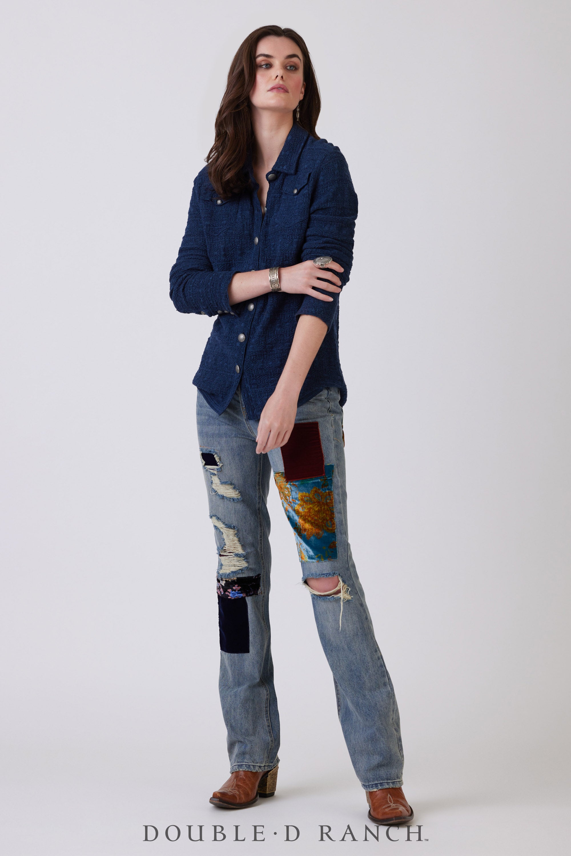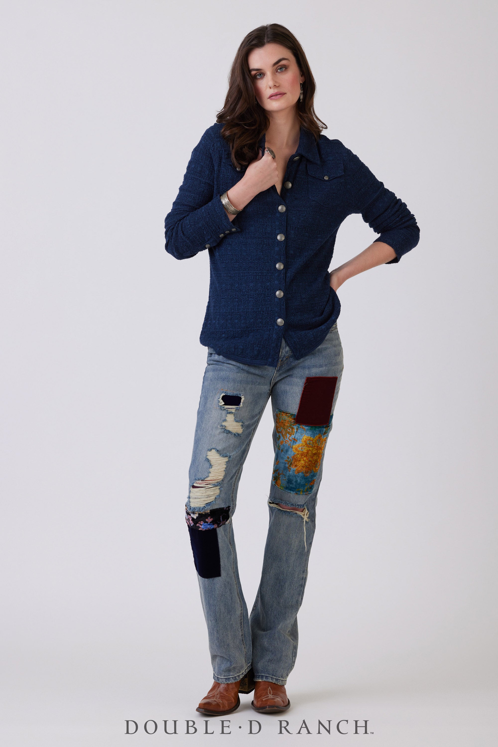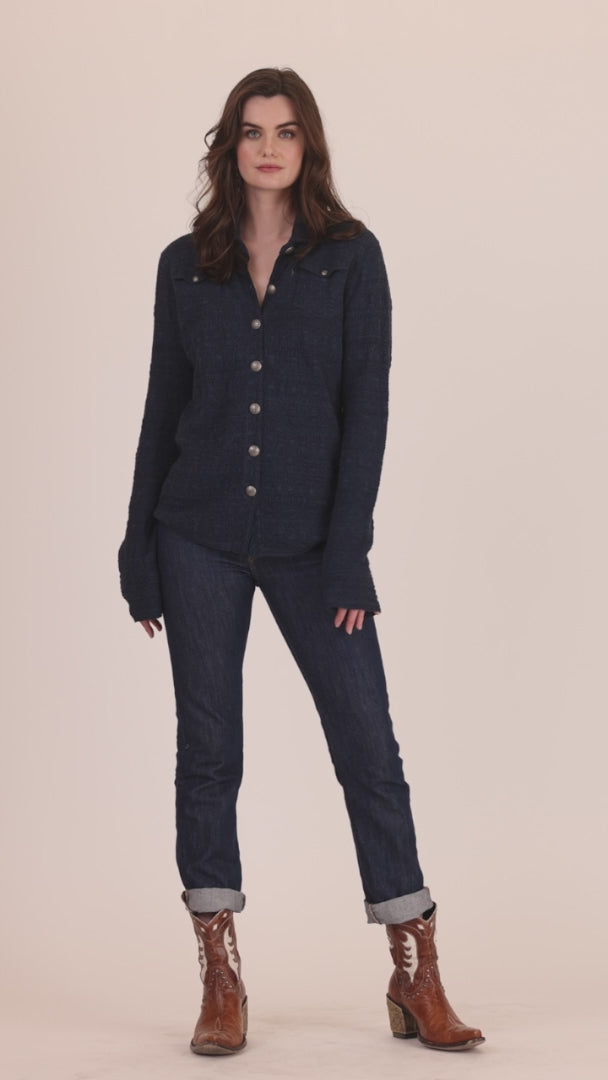 You’ll be surprised at all the ways this blue beauty works in your wardrobe. It’s a slightly textured beautiful midnight blue complemented with custom concho buttons. It can be a shirt or a jacket and works with everything from denim to dressy pants. Trust us, you’ll reach for it more than you realize.