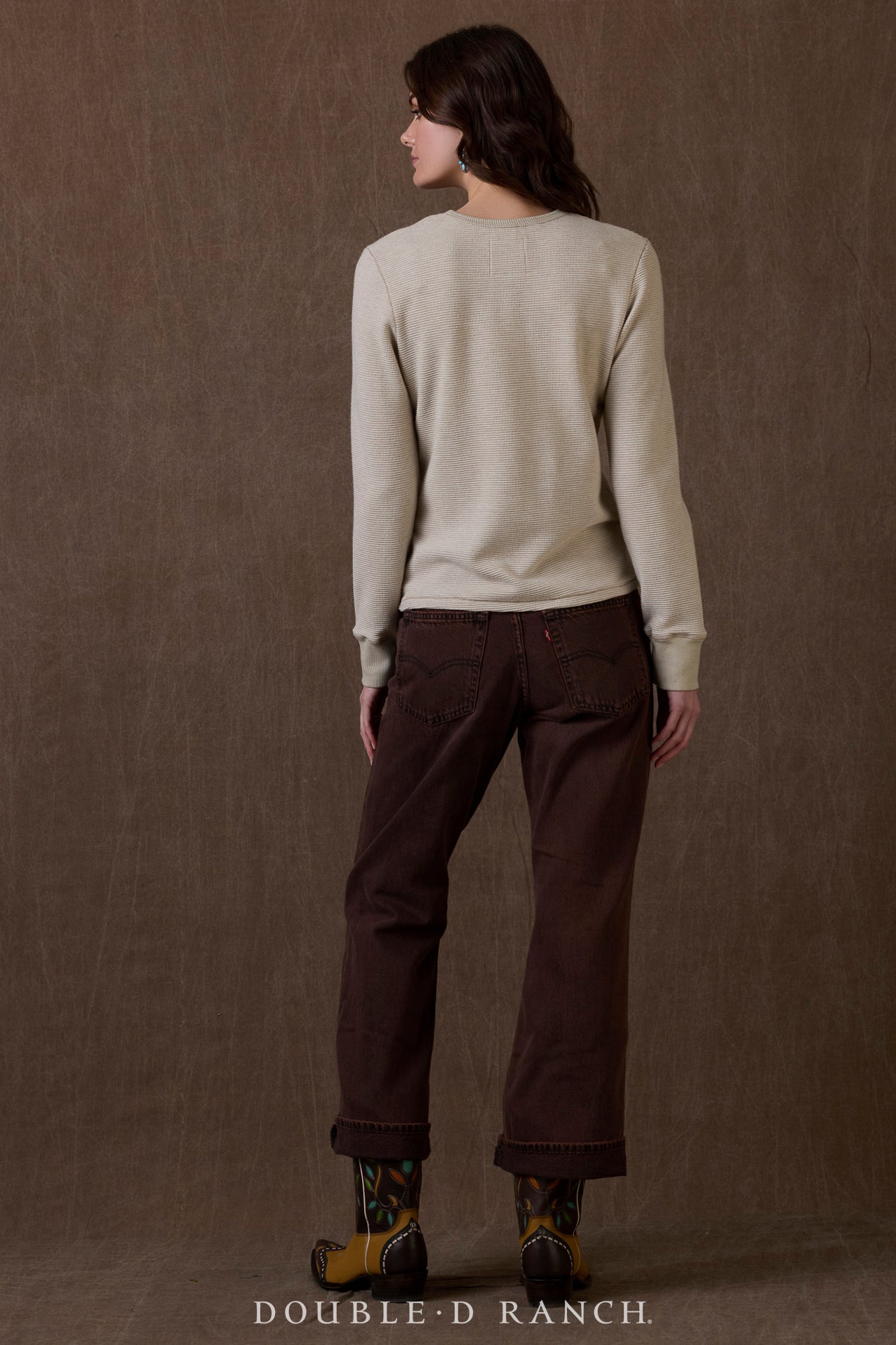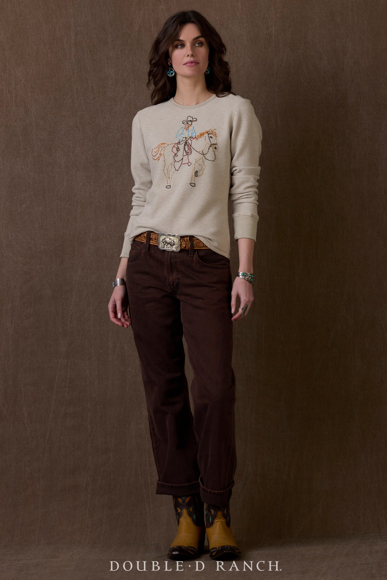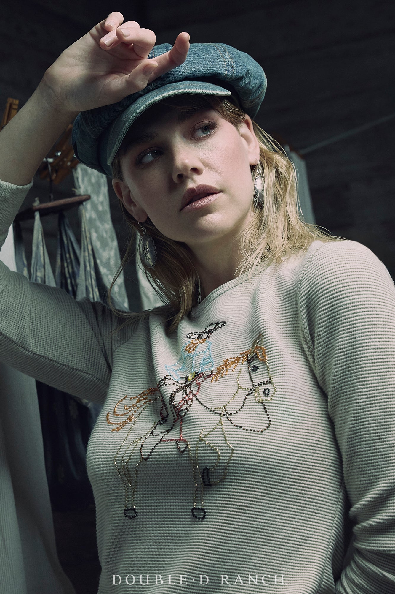 Much of this collection is inspired by memories and garments from our own grandparents, but this darling little number was inspired by being a grandparent. The beaded outline on this chic waffled tee is inspired by the cutest little cowboy there is, Cheryl’s own grandson. It's a fun everyday piece with a bit of flair and darling backstory.