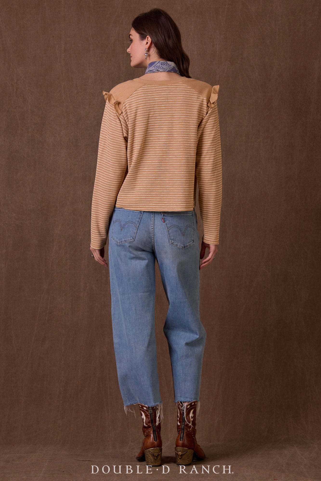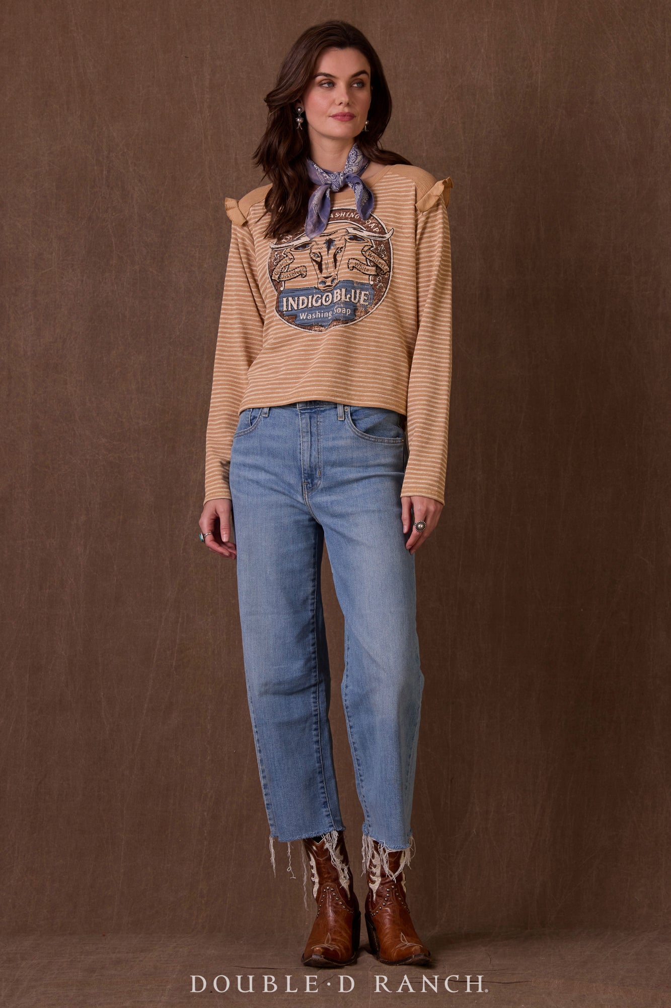 Everyone loves an easy-to-wear top with some elevating elements, and this long-sleeved number fits the bill. The earthy hue is complemented by subtle striping, emblazoned with an ‘Indigo Blue Washing Soap’ graphic and finished with charming ruffled sleeve caps.