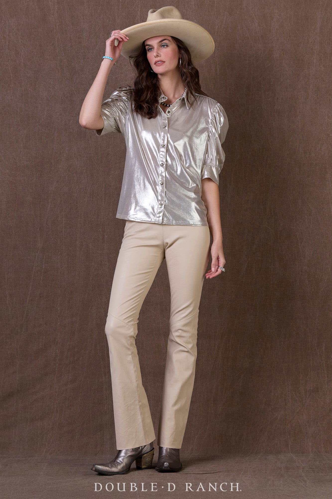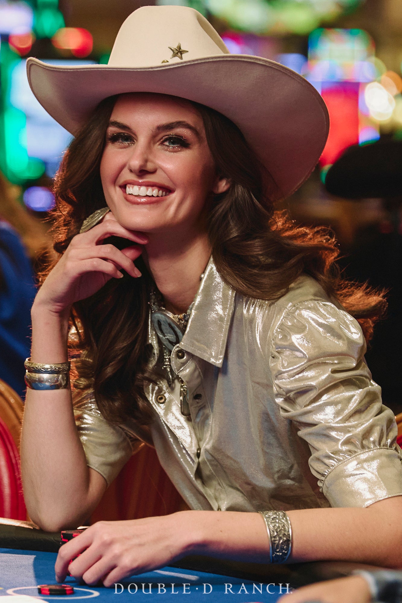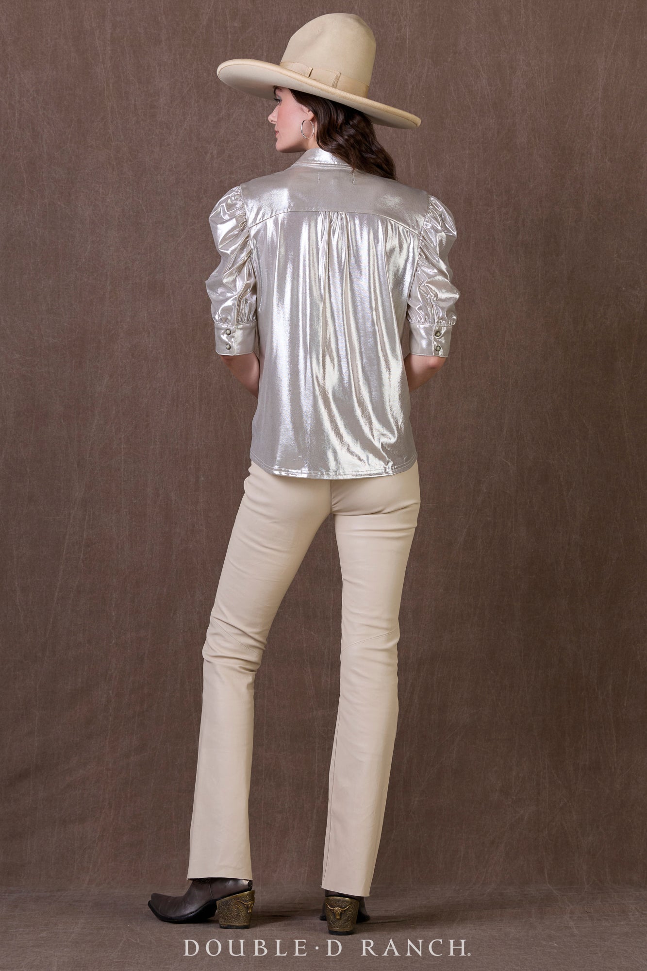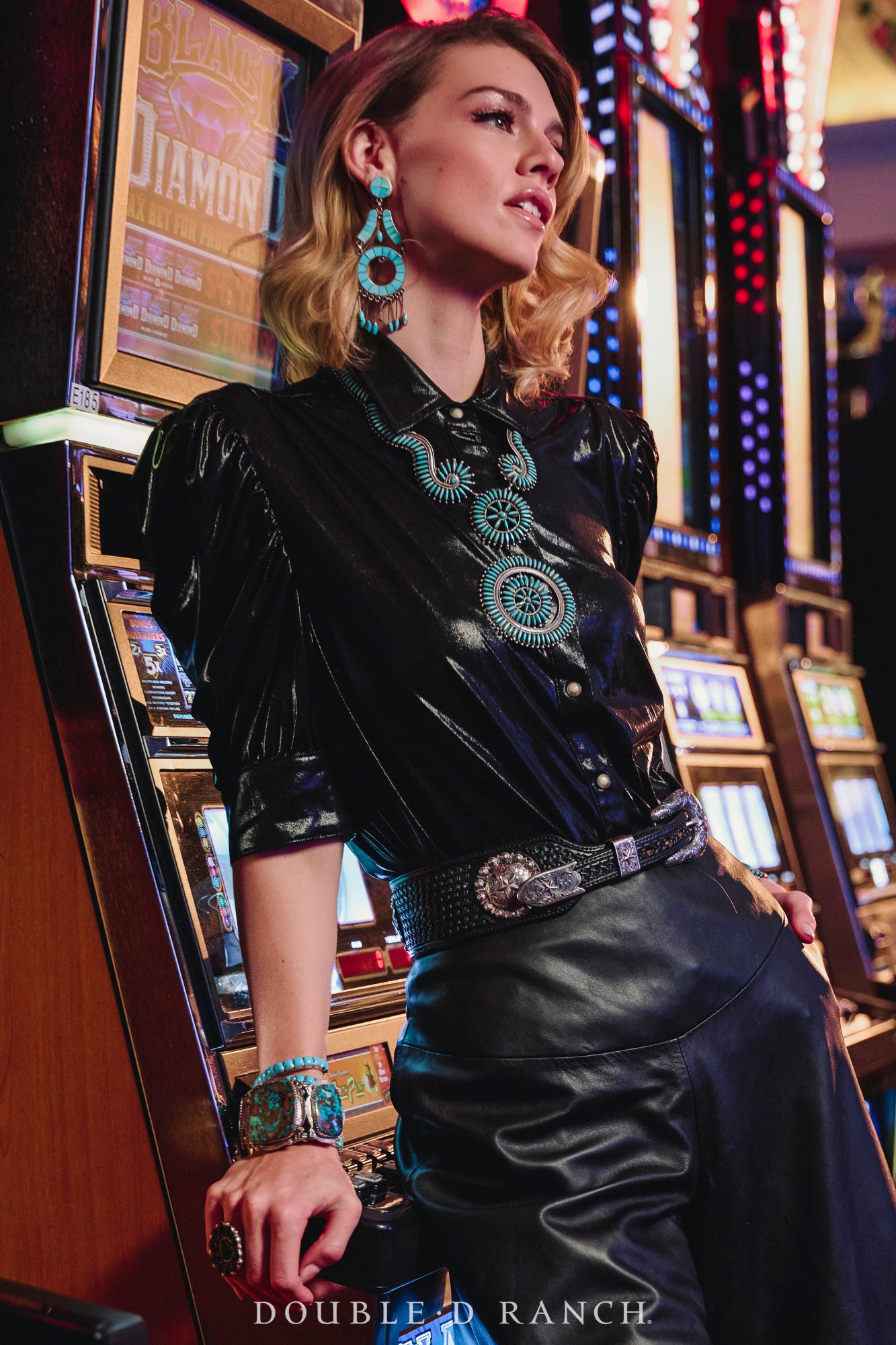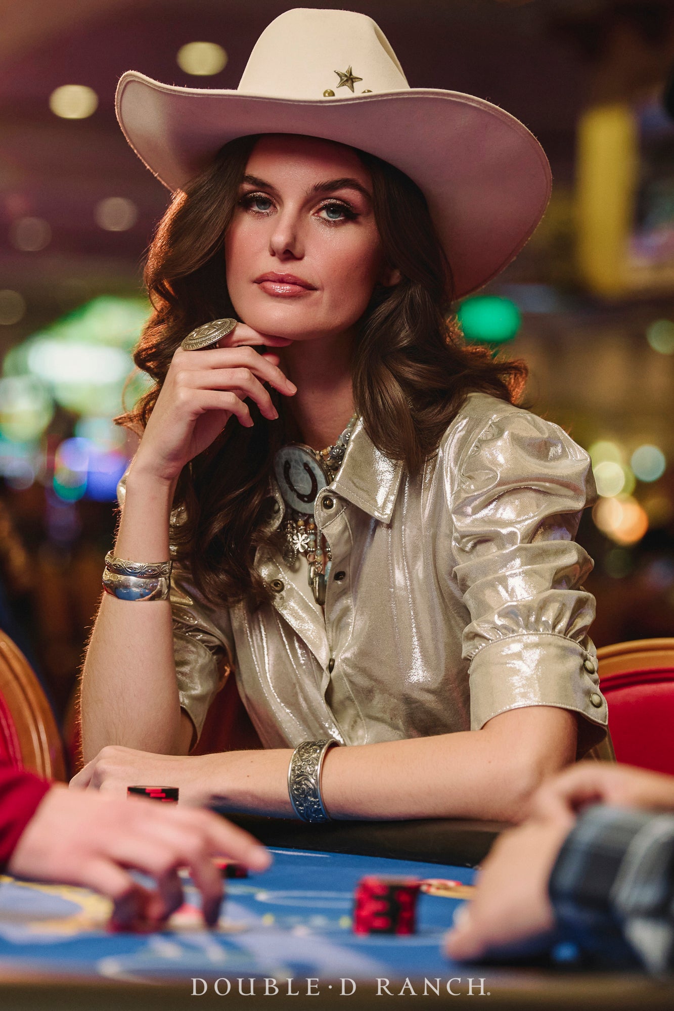 This chic shimmery beauty is ready for NFR, the holiday season, and beyond! The pretty pearl snap comes in two colorways – a shimmery silver and a glossy black – and it features feminine puffed-and-cuffed ¾ length sleeves that make it feel both dressy and festive.