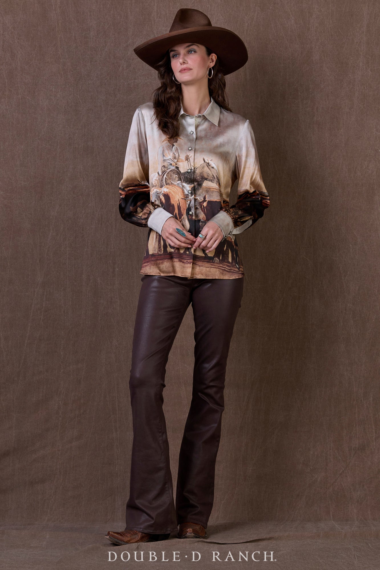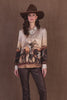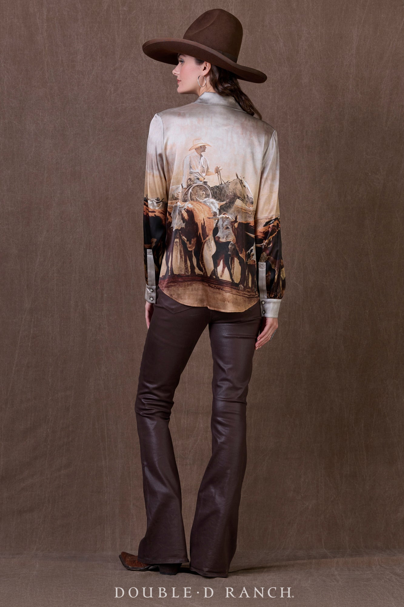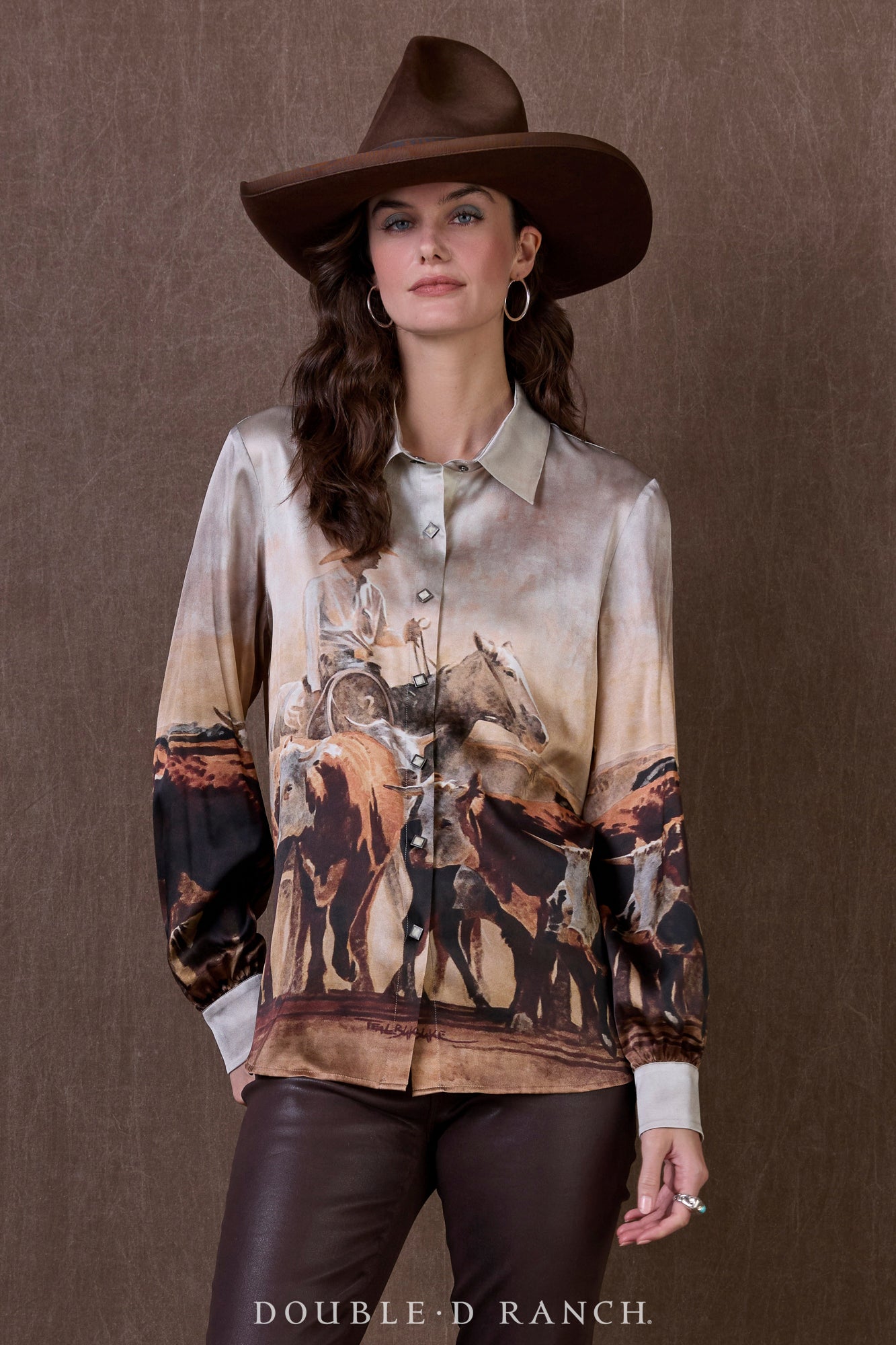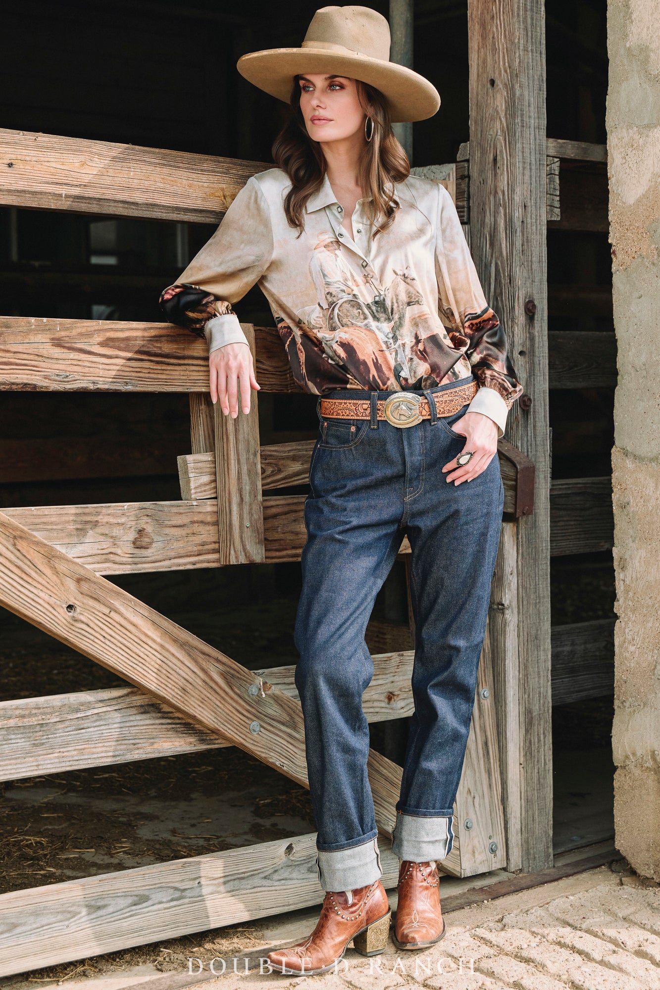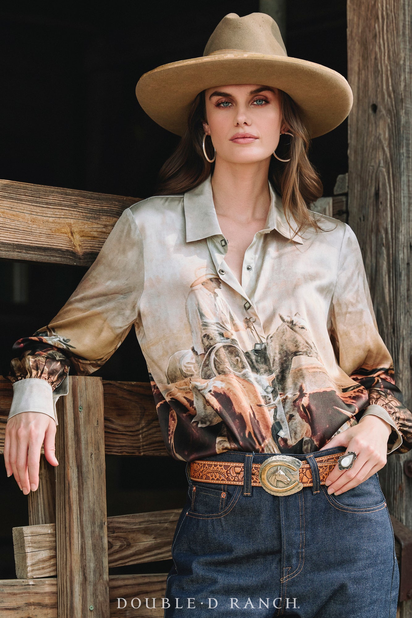 This beautiful pearl snap is a classic cowgirl dream. The irresistible silk is adorned with a 360-degree depiction of a classic cattle drive, and it’s finished with askew square pearl snaps for that finishing touch of western charm.