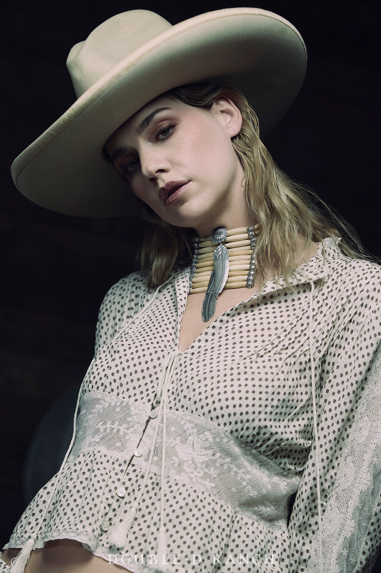 One of the unexpectedly exquisite things we explored in the Wash House collection is interpreting undergarments as outerwear. It’s a trend that’s dominating the most upscale European runways, and it’s authentically in line with what we’d have found in among our trunk treasures at Granny’s. This chic sheer top channels the aesthetic of an old-fashioned dressing gown with a tasseled-tie front and lace panels. It’s dainty and delicate with a decidedly feminine feel.