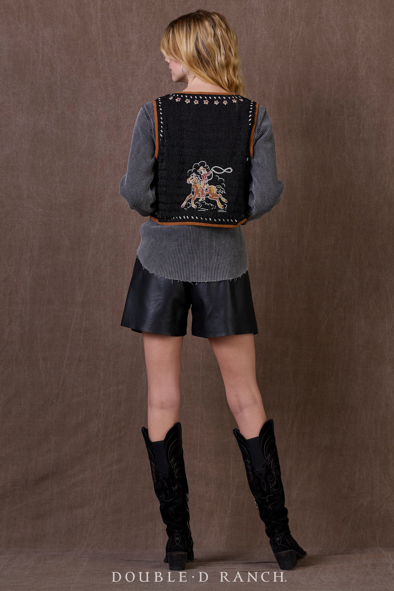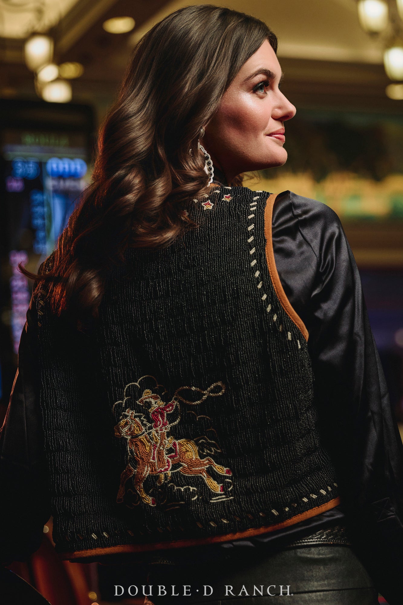 Finish your outfit off with a little flair by adding this beautiful beaded vest. The cute, cropped boxy silhouette feels fun and fresh (and pro tip, helps create a waist!) and it’s embellished with all-over beading depicting a fun Western motif. It’s finished with contrasting goat suede trim for that extra pop!